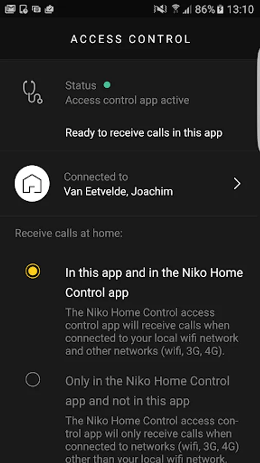 This app is an extension of the Niko Home Control app which can only receive calls within the WiFi home network. So in other words, you can choose not to use the access control app within the WiFi home network and use the Niko Home Control app instead.
