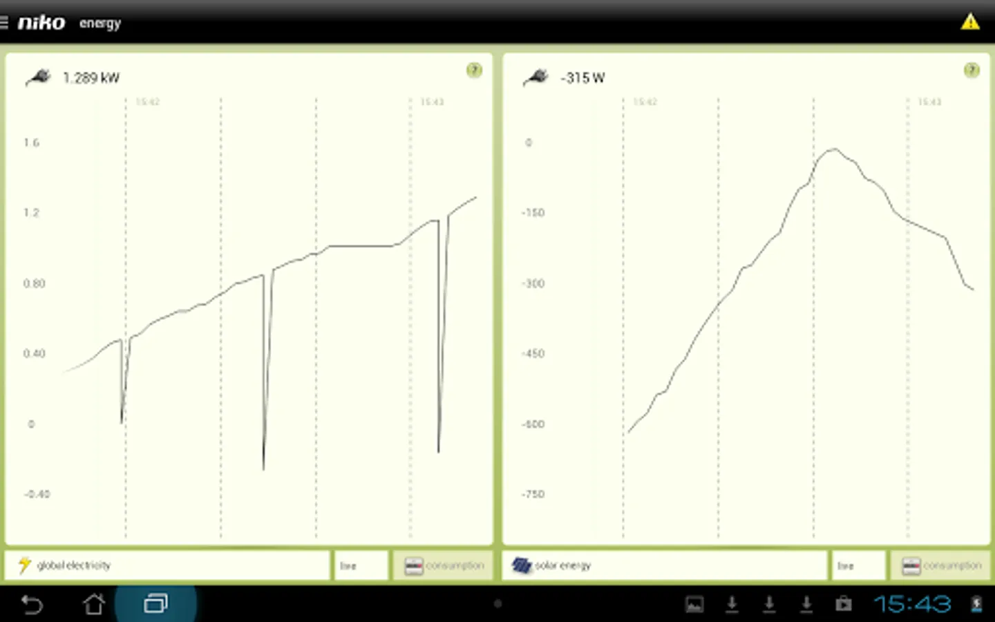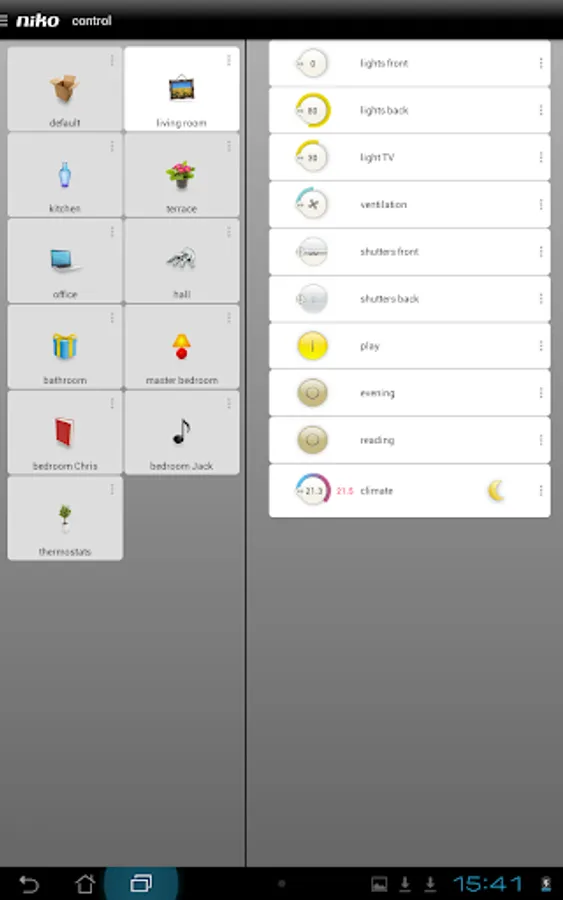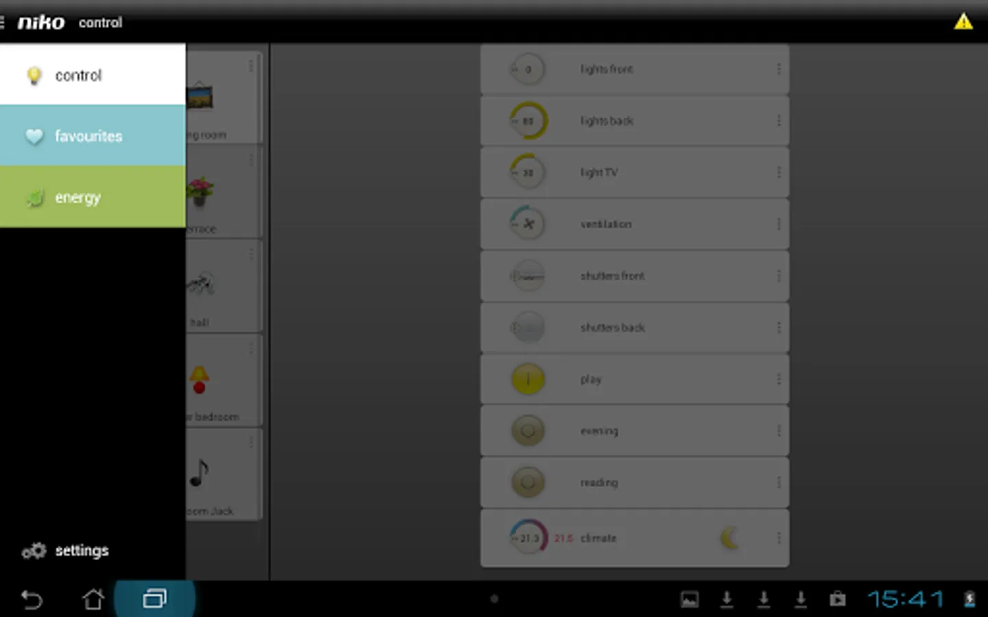 This app allows you to create a central and easy-to-use control system on your smartphone or tablet. The user-friendly interface gives the resident access to all the functions of the Niko Home Control installation, such as lighting, roll-down shutters, gates, heating and ventilation. Also information about the electricity, gas and water consumption will be displayed on the screen.