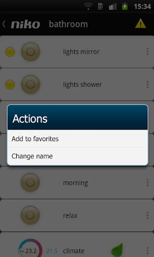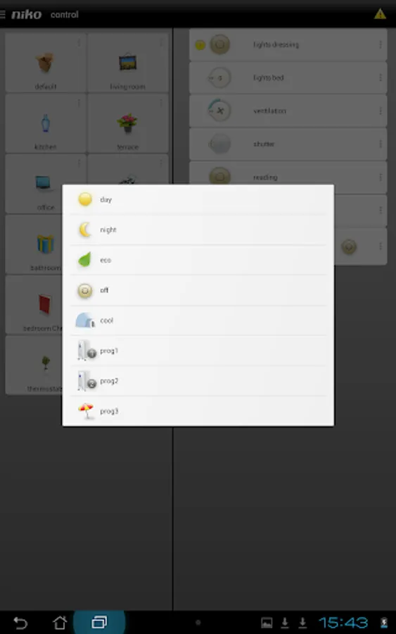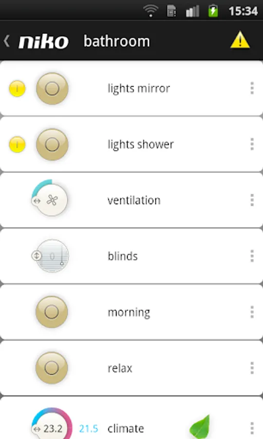 All assigned/programmed actions are listed per location. Shuffle them around to prioritise your locations and actions. Change names or select a different symbol from the library. Remotely control your (dimmed) lights, ventilation, roll-down shutters, sun blinds or thermostat. Instant feedback.