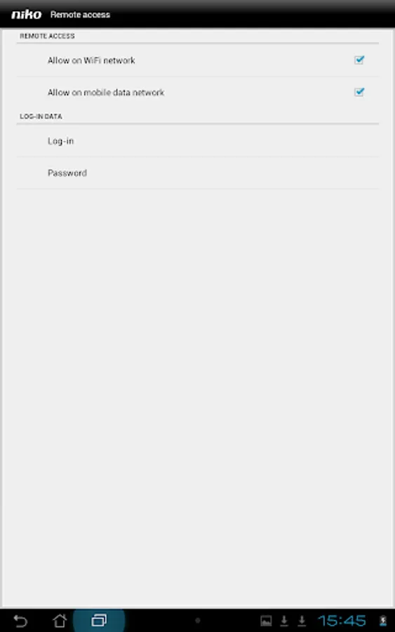 • Set your log-in and password for the remote control service using the settings menu of the Niko Home Control app.