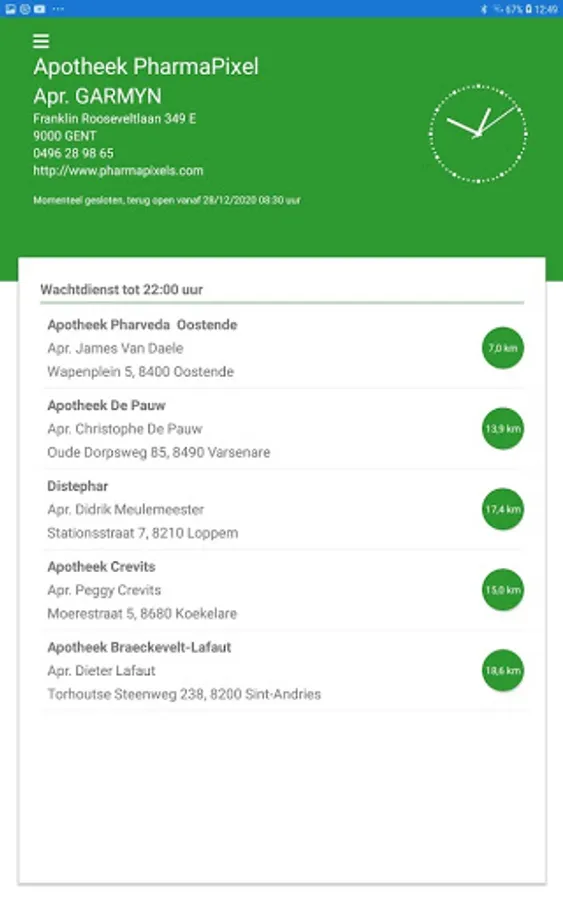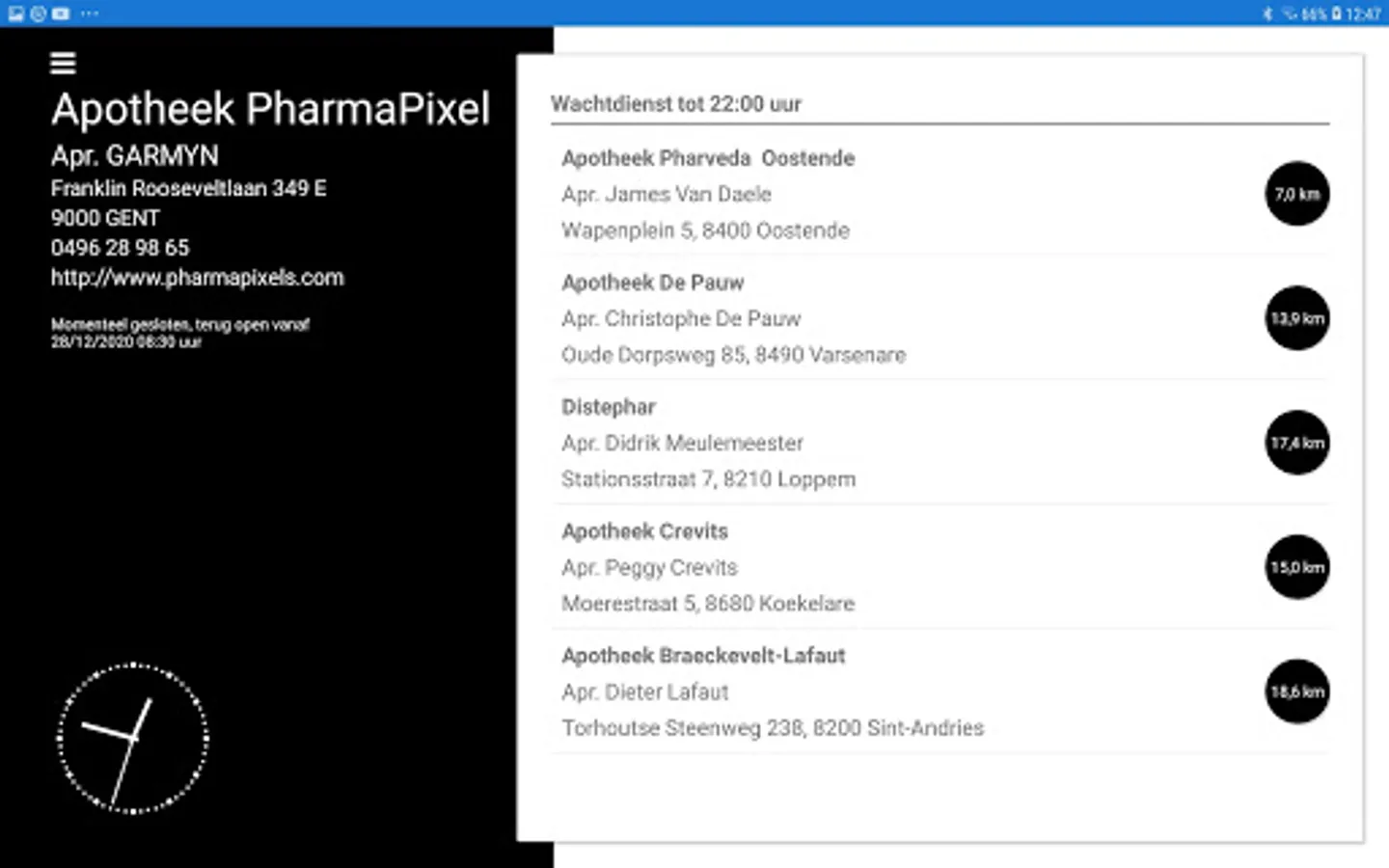 On-call duty monitor is a professional application for Belgian pharmacies with which the current on-call duty schedule can be displayed to pharmacy customers. ... With the help of this tablet application, the customer immediately sees which pharmacies are on duty in the region. As a pharmacist you only need a PharmaPixels account and the tablet application will do the rest. In this way, the pharmacist can fully focus on the best service for his customer.