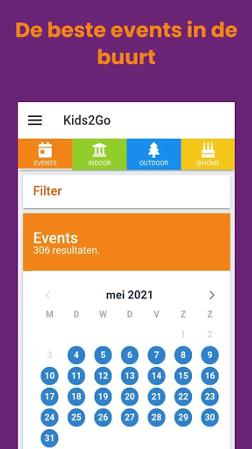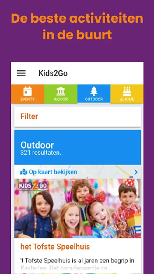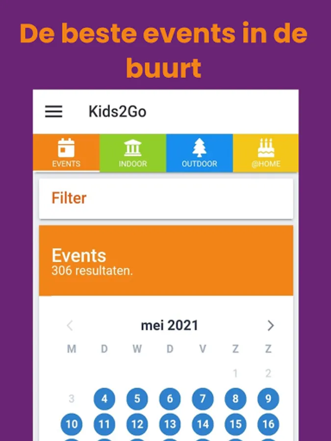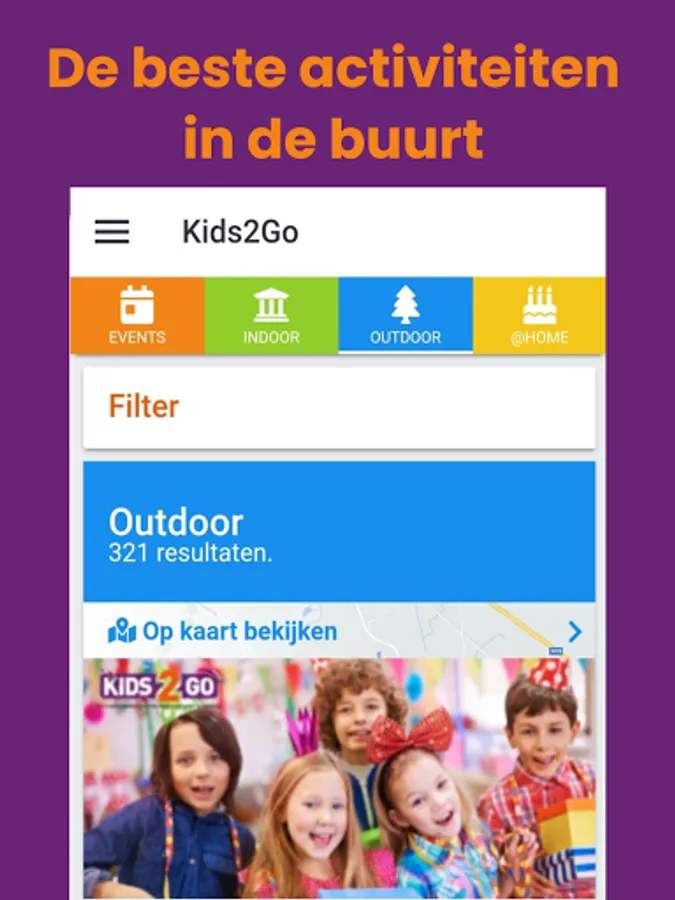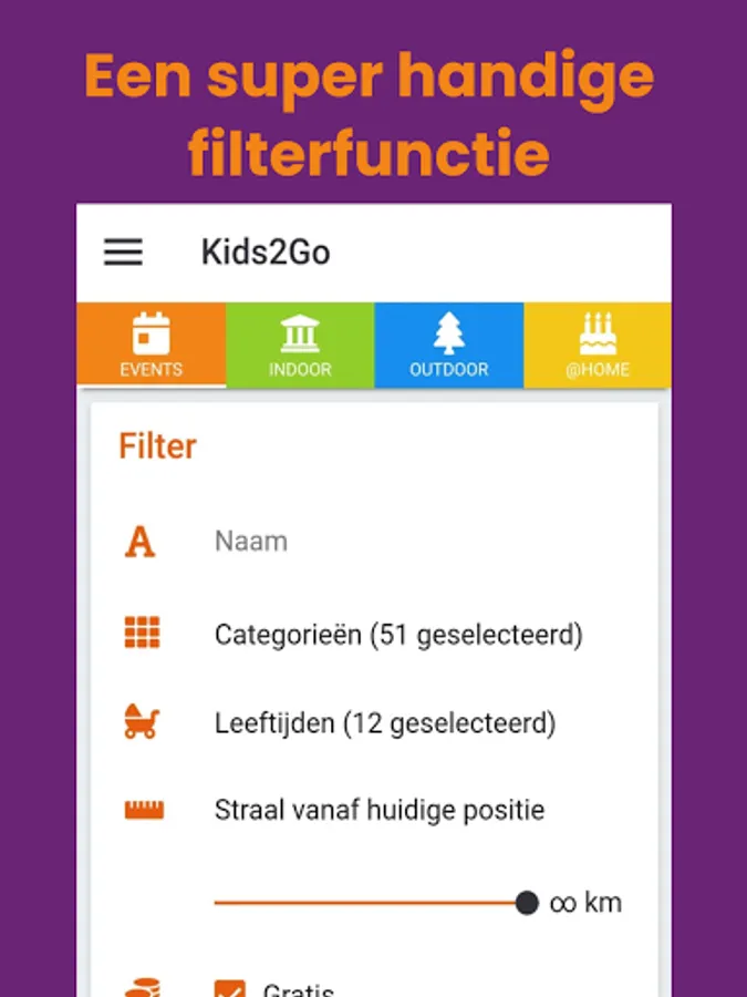 At Kids2Go you will find both indoor and outdoor events, always updated and all centralized in 1 user-friendly app. Without annoying advertising!