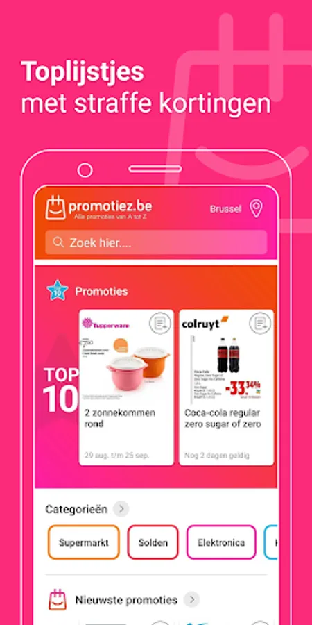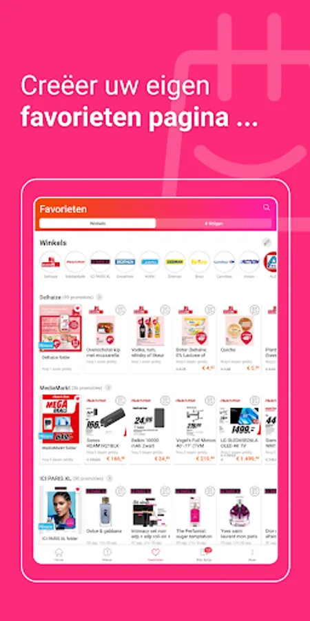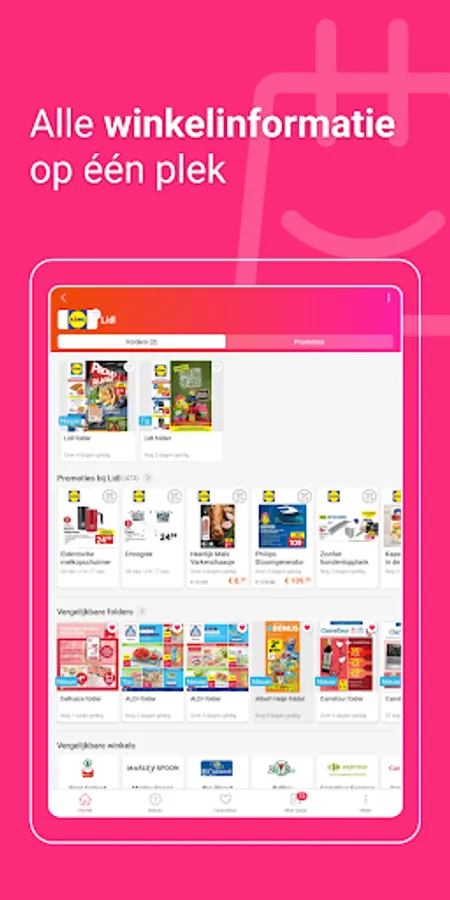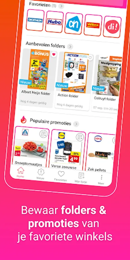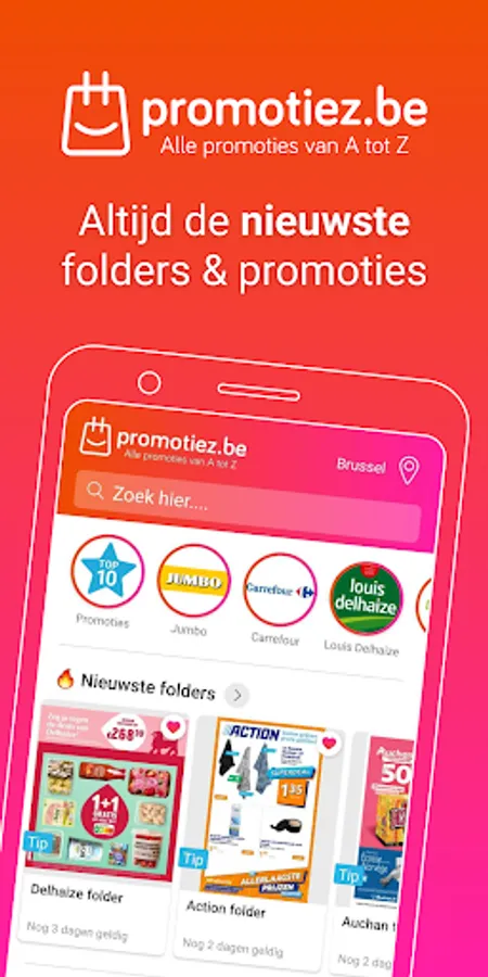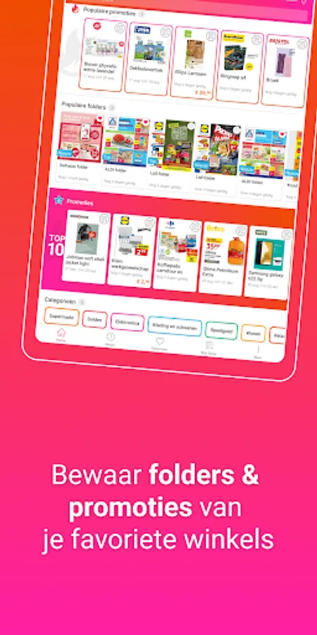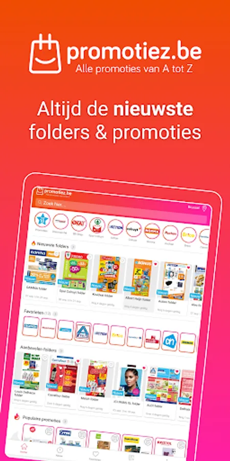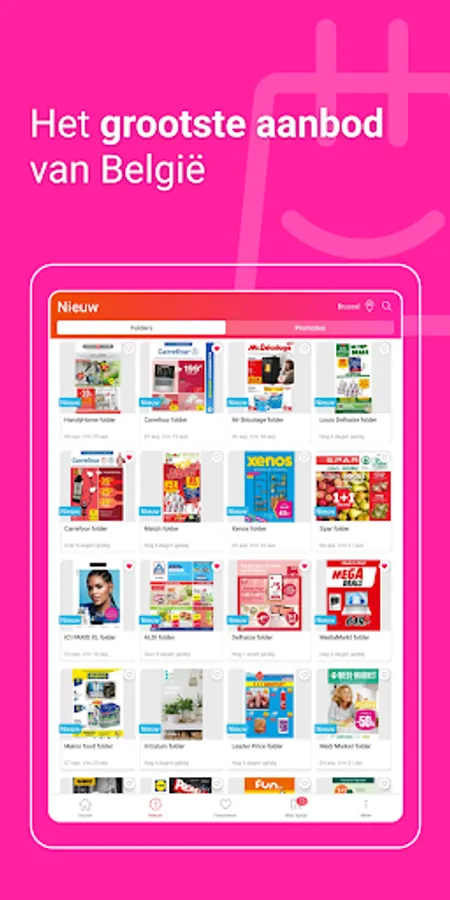 Our Promotiez app always shows you the latest promotions, folders and folder offers from ALL large and small stores throughout Belgium. Not only all supermarkets and DIY stores, but also electronics stores, fashion, toys, computer, and beauty stores and much more. We have even listed local shops for you. If you want to select a case as a favourite, you can do this simply by clicking on the heart. With this you are always the first to know about offers from your favorite shops and you have conveniently collected your favorite advertising brochures.