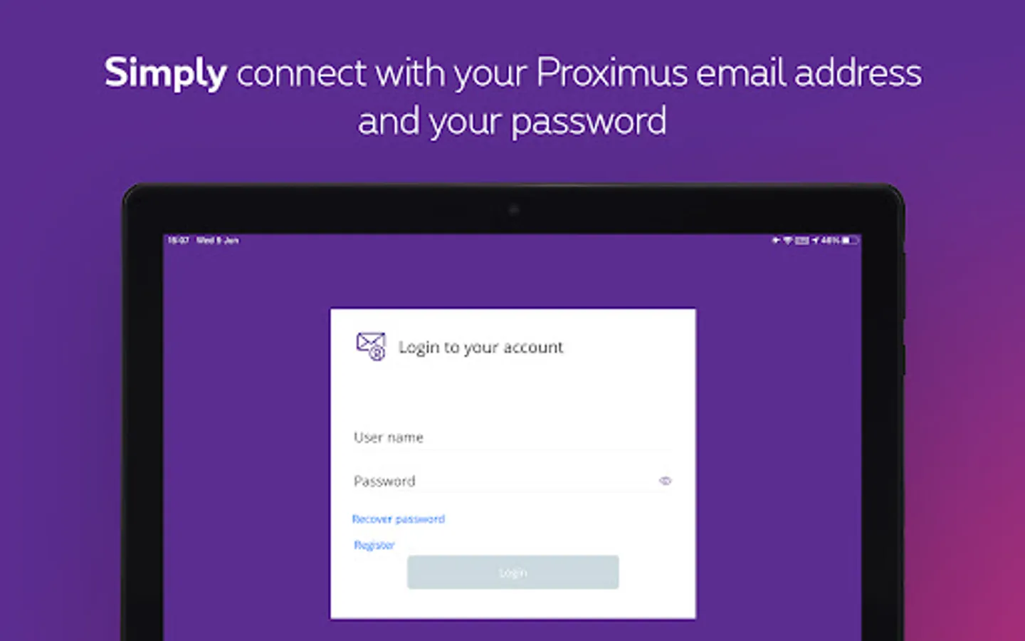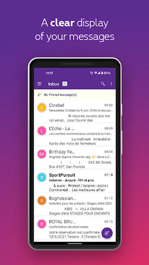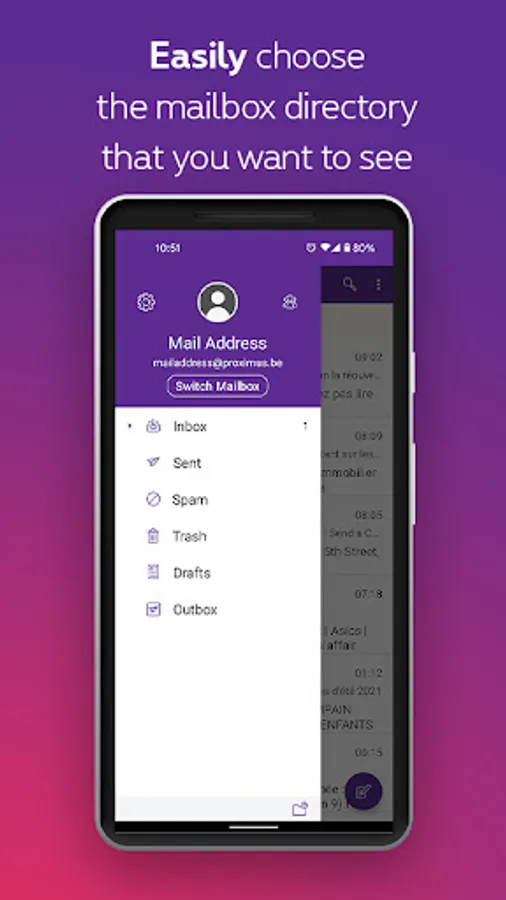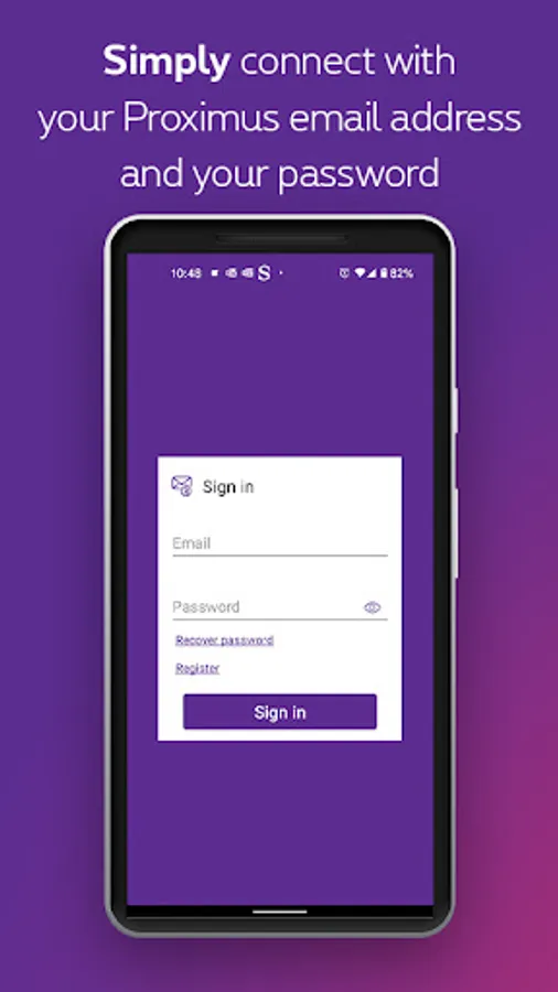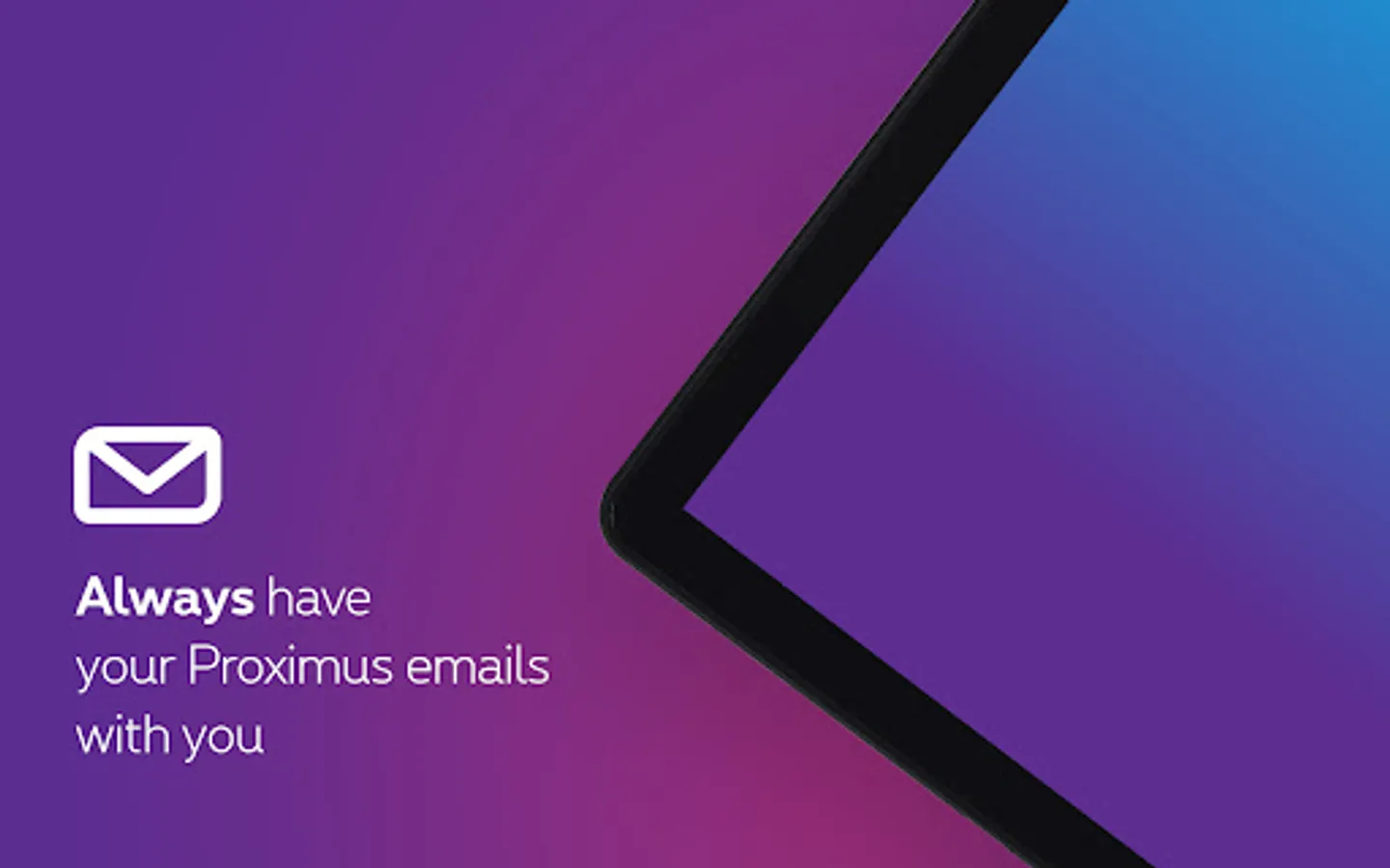 Proximus mail is an easy-to-use application. With just one click, you can read, send or receive your e-mails from a mobile device. Thanks to its push notification, you will always be notified of new messages. Never lose contact with your friends and family again.