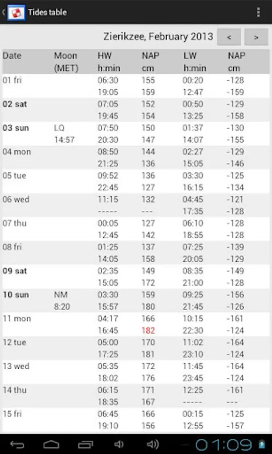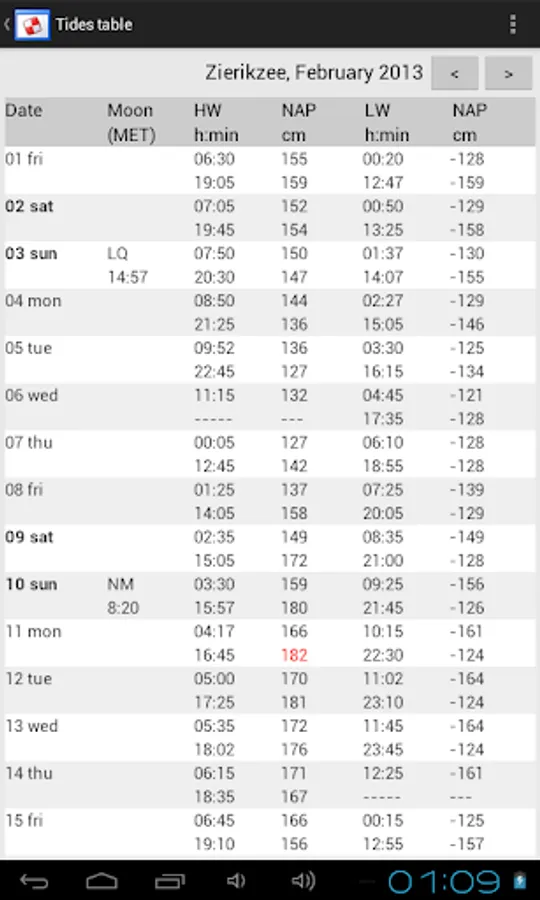 The App provides tide table for several spots in Zeeland (Netherlands) and Belgium. It computes High/Low water time as well as NAP water level and Moon phases for the selected location. It also provide an overview calendar of the neap/spring tides and useful contacts for marine activities (weather, rescue,...)