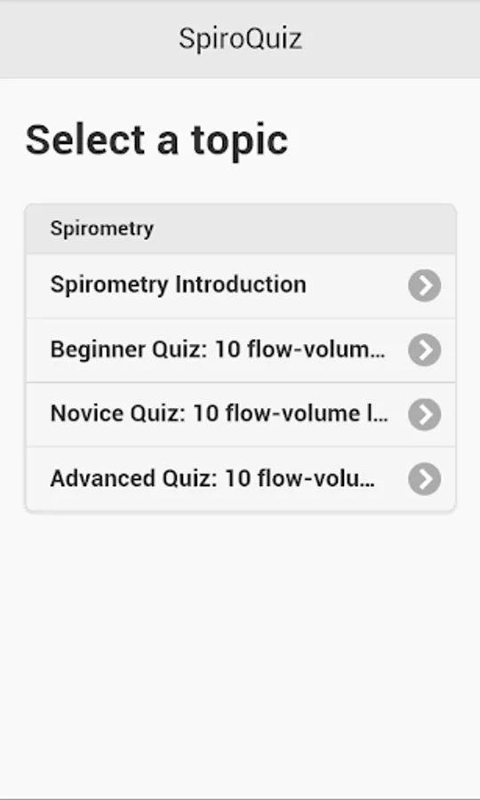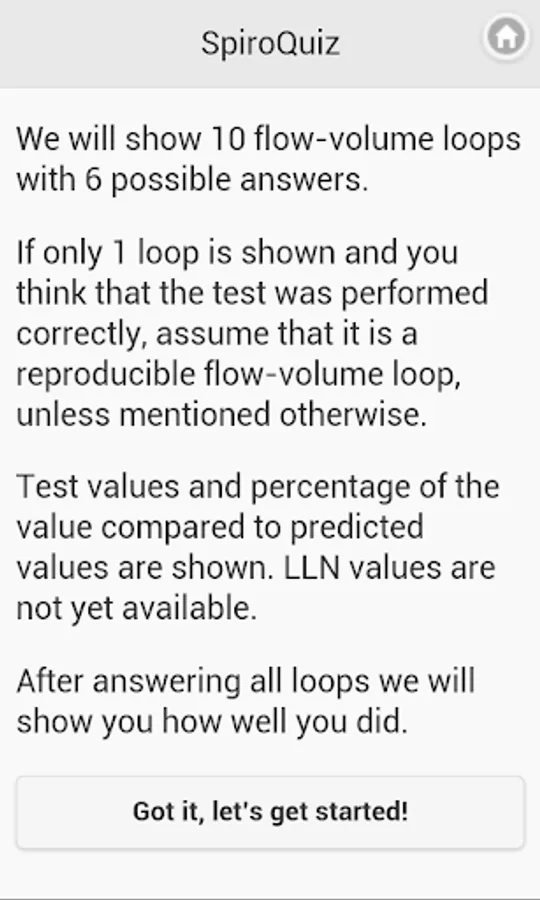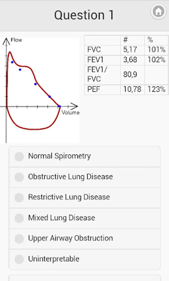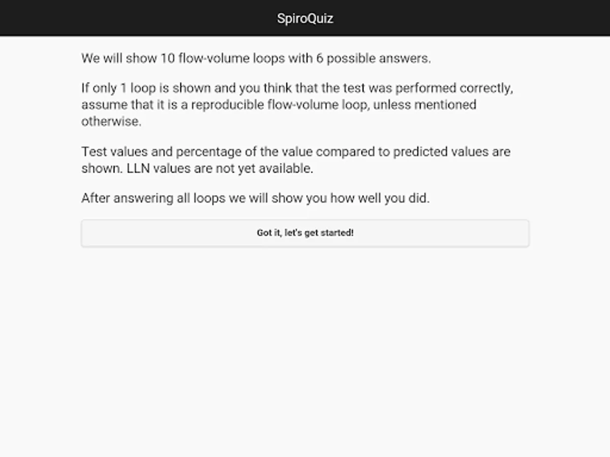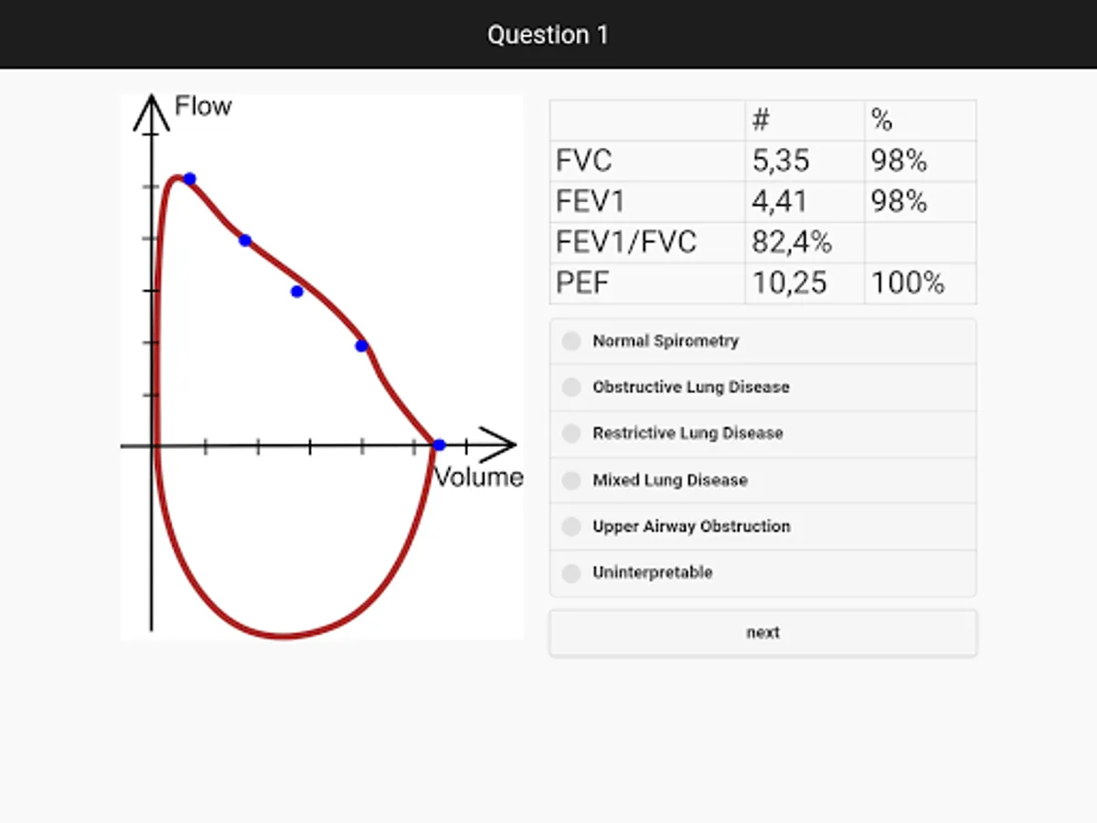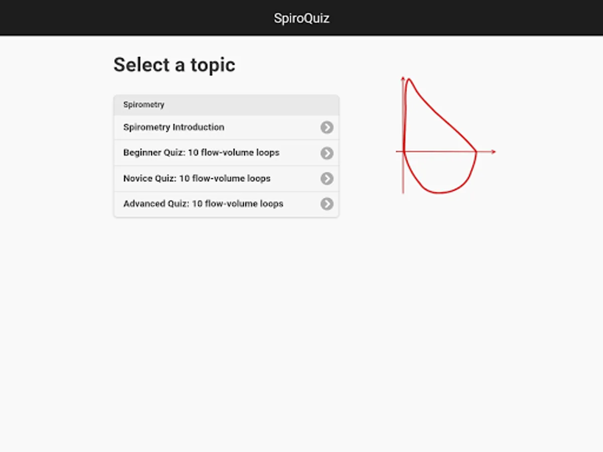 The app will show spirometry loops and values and lets you decide on the diagnosis. At the end of the session SpiroQuiz will show you how well you did.