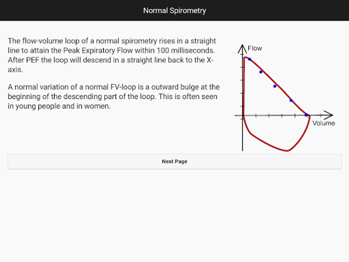 A short introductory course on spirometry and FVC loops is given. The app will explain the difference between a normal spirometry, obstructive lung disease, restrictive lung disease, mixed lung disease and the different types of upper airway obstructions.
