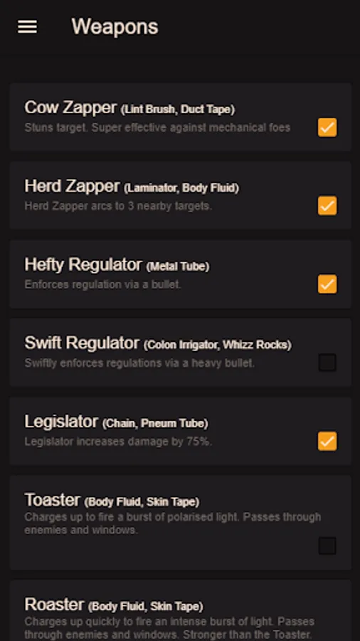 List of all weapons.