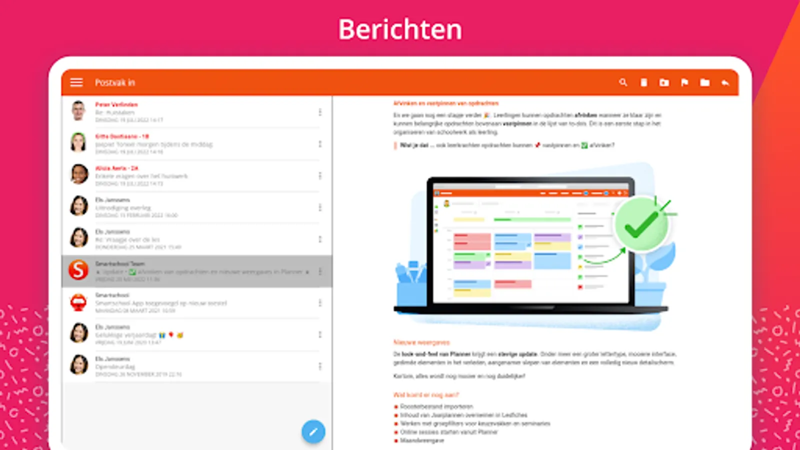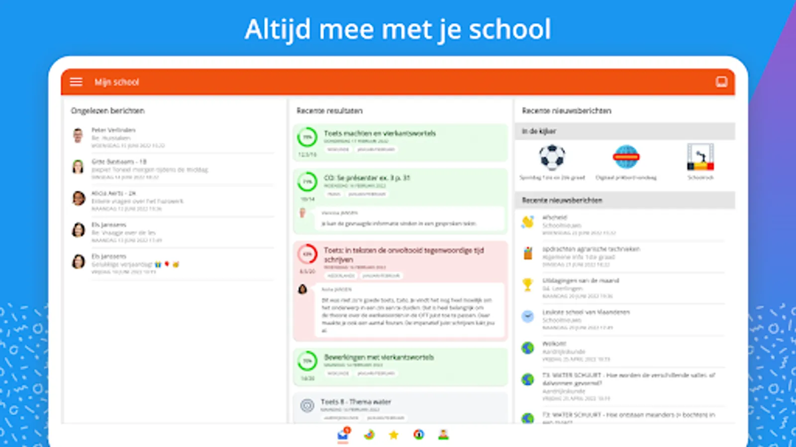 With the Smartschool App you stay involved with your school, even when you are on the road. The app is optimized for both phones and tablets and offers great added value. Thanks to the push notifications, you are always aware of your new messages. https://www.smartschool.be/apps/app/