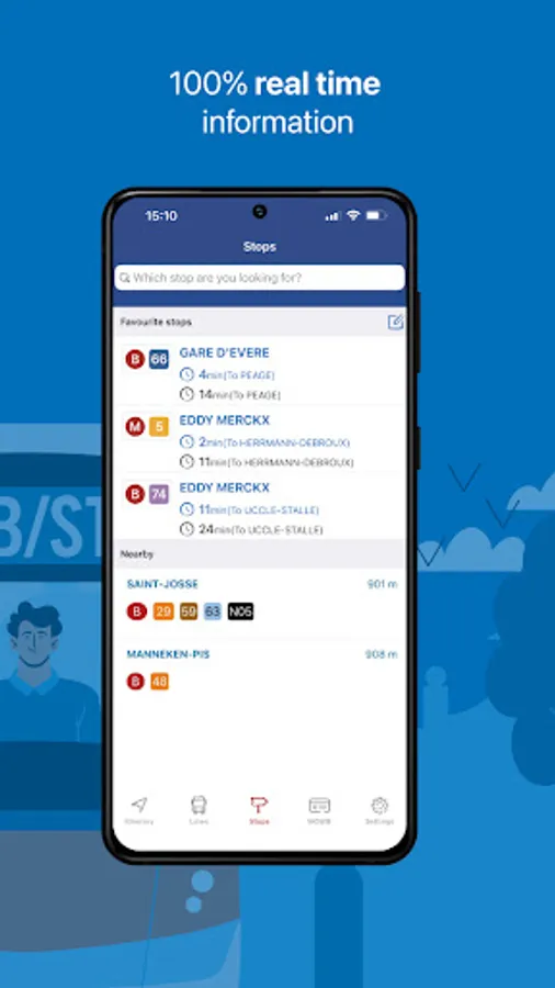 By adding a stop or a line to your favourites you can very quickly check real time departure times or display timetables. Information on service status and possible disruptions can also be displayed at any moment.