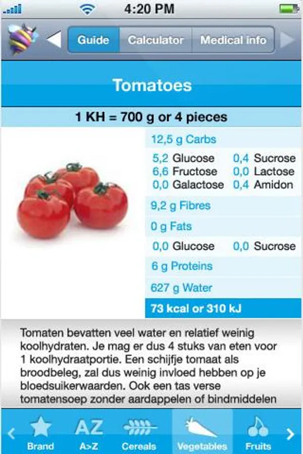 The Sweetbee Carb Counter enables you to count Carb units en Calories. In a visual way it shows more then 300 every day products converted to carb units. Unmissable for people with diabetes, useful for everybody who's taking control of his calorie intake. It show's the carb Unit per product,in pictures and the glycemic index in a graph. A must have for all diabetics, to manage insuline treatment and create knowledge on all food products.