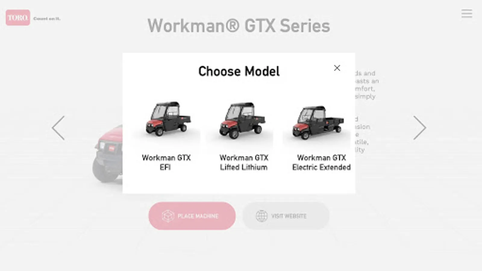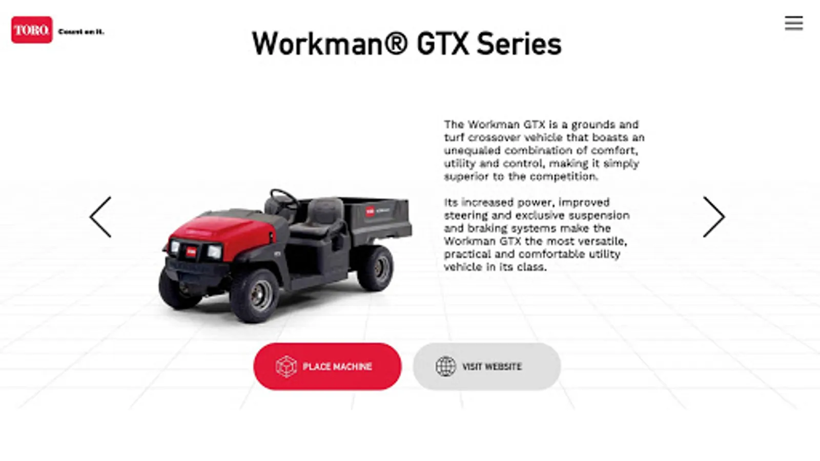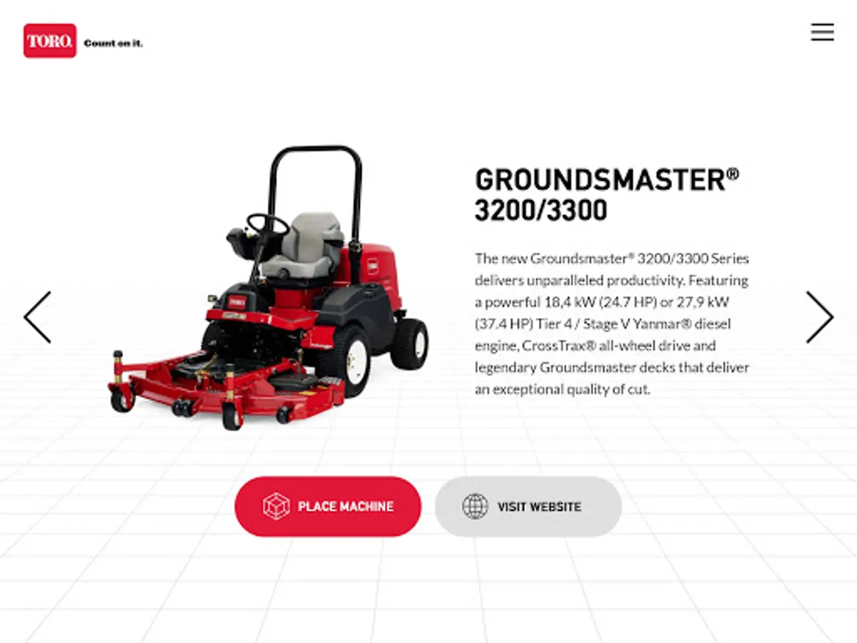 Toro Augmented Reality App - An interactive experience where you can interact with virtual Toro products in your real-world setting. Configure virtual products in real time while physically moving around the product to get different perspectives/views.
