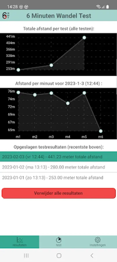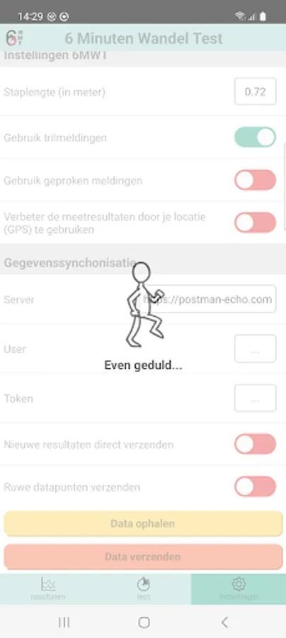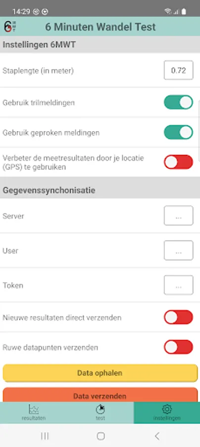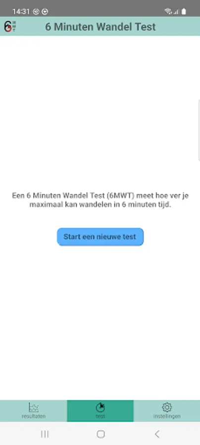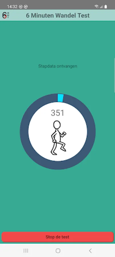 The 6 Minute Walking Test (6MWT) measures the maximum distance you can walk in 6 minutes, and is a tool to estimate improvement in physical fitness. This is done by counting your steps (and multiplying them by your stride length) or by using location tracking. A standardized 6MWT happens indoors, at a marked distance. However, a study has shown that the accuracy of a random trajectory measured by the number of steps and stride length is sufficient to measure significant differences, and therefore progression. The app optionally provides the ability to synchronize data via an HTTP REST API.
