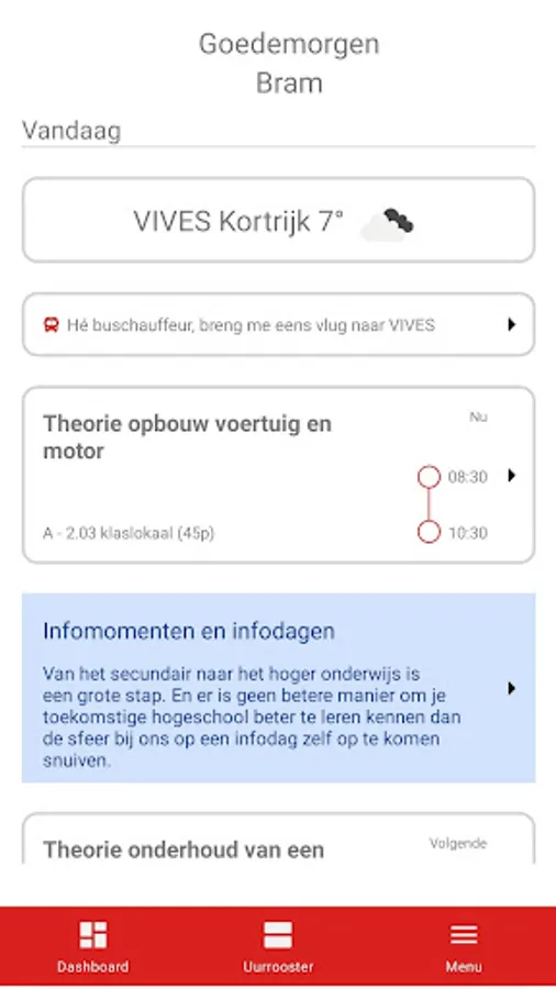 The official VIVES app to consult your personal timetable. It is developed by students for students and teachers. A teacher absent? Sign up with your VIVES account and receive a notification when a teacher in your training will be absent. This app is a result of the Abinet training company within the Bachelor of Applied Informatics program.