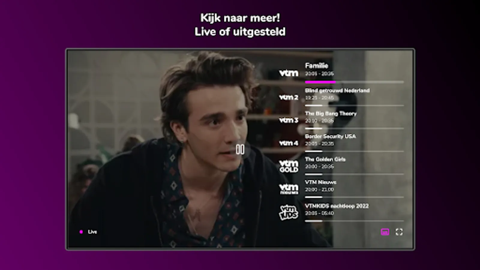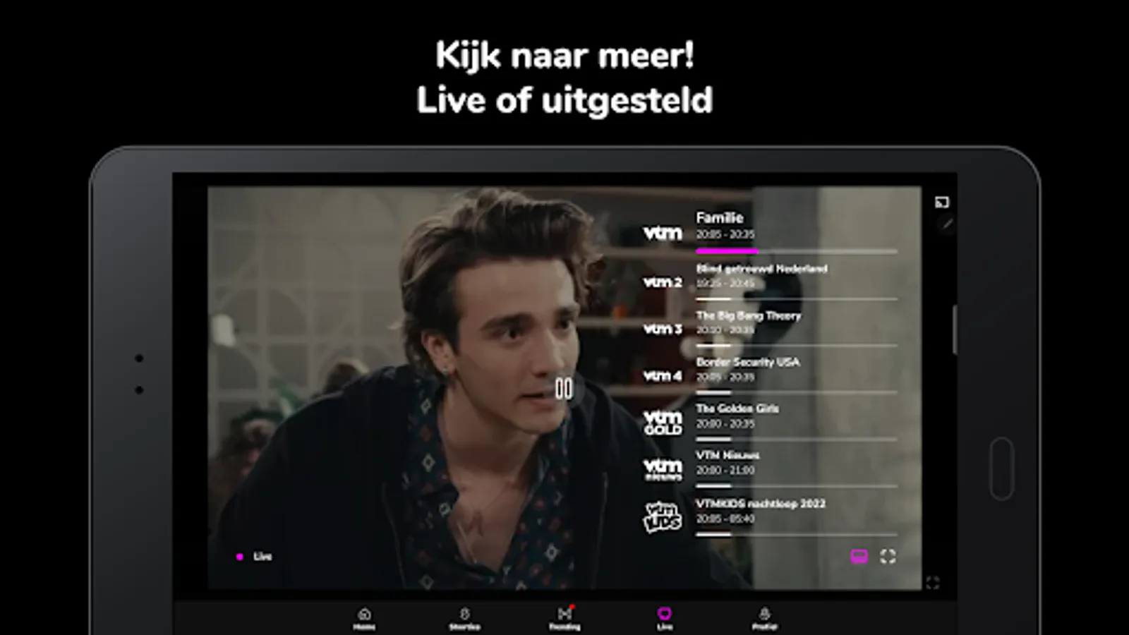 Watch live or delayed? You choose with VTM GO. Zap through all our channels smoothly or catch up on missed episodes of your favorite program. Because with VTM GO you can look back up to 30 days, and sometimes even longer.