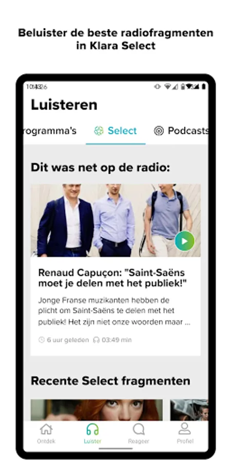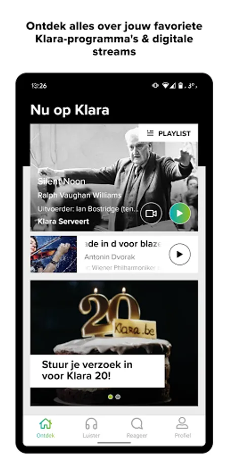 This application for smartphone you always Klara pocket. You can quickly, reliably, easily and in high quality Klara listen to your favorite programs and re-listen wherever and whenever you want. All this in a familiar environment Klara, with visuals of the composers and / or performers and presenters.