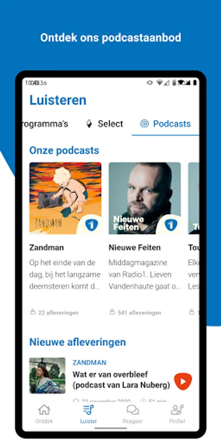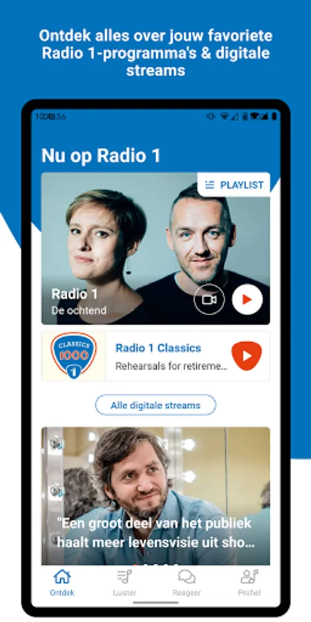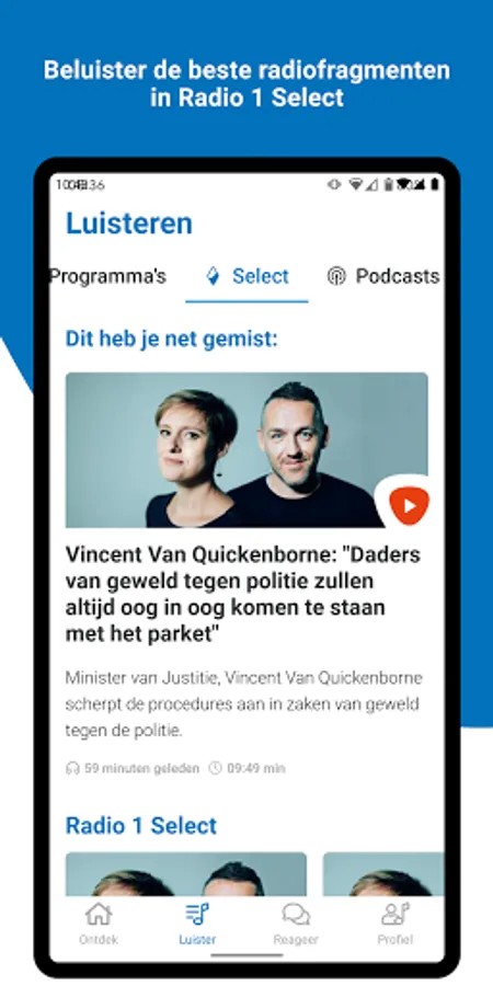 With this application for smartphone you've Radio 1 all its own. So you can quickly, reliably, easily and in high quality listen to your favorite Radio 1 programs and re-listen whenever and wherever you want. All this in a familiar environment Radio 1, with visuals of the songs and the presenters.