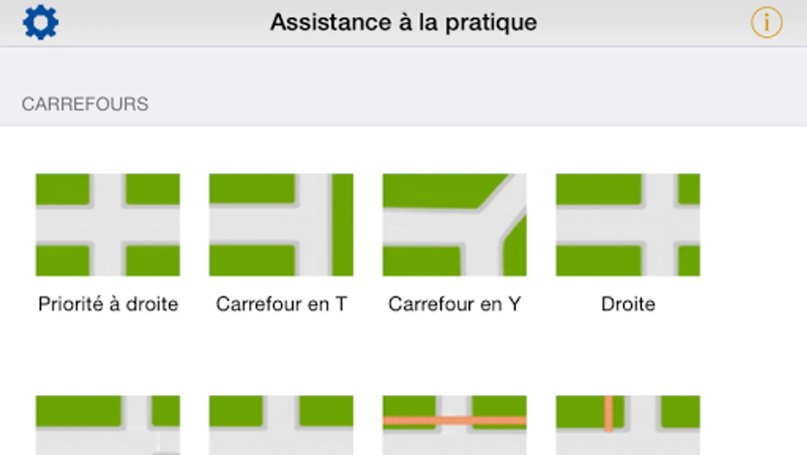 • In the main menu, choose one of the basic conditions (roundabout exit, intersection ...) or launch the interactive map.