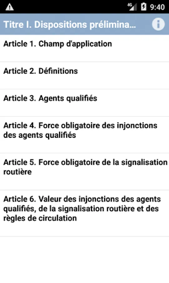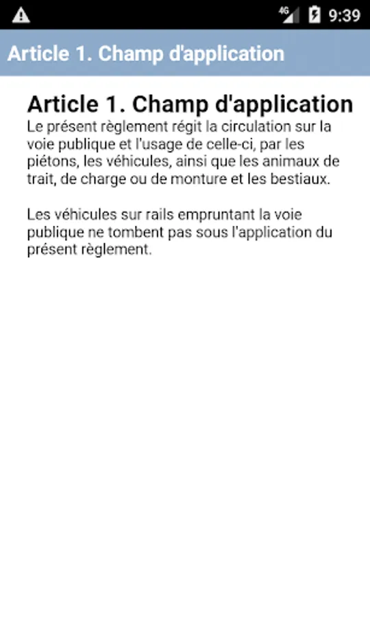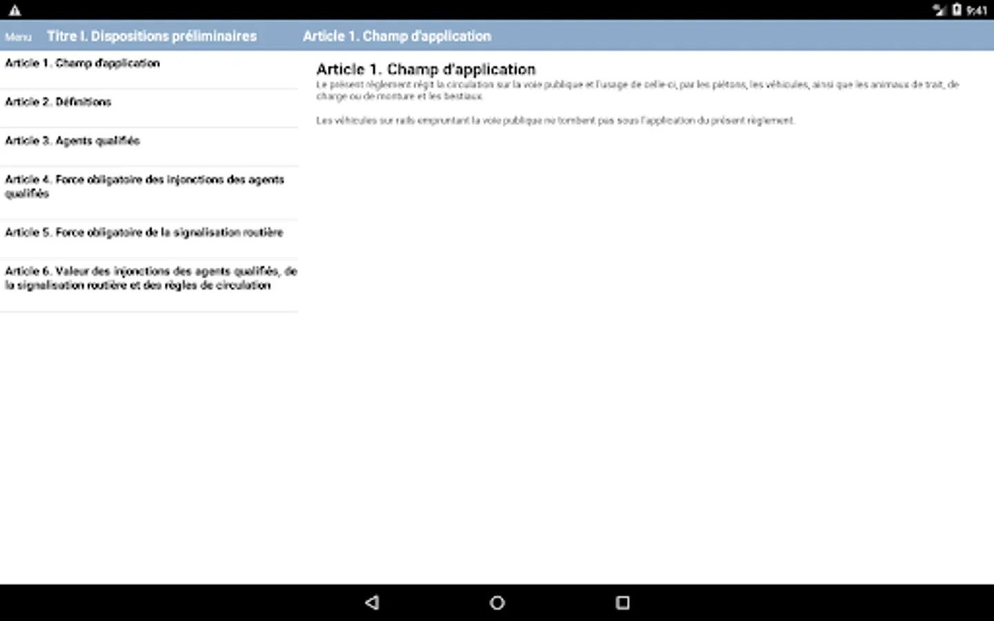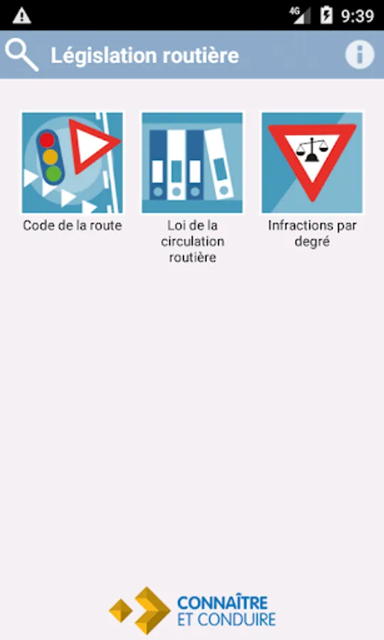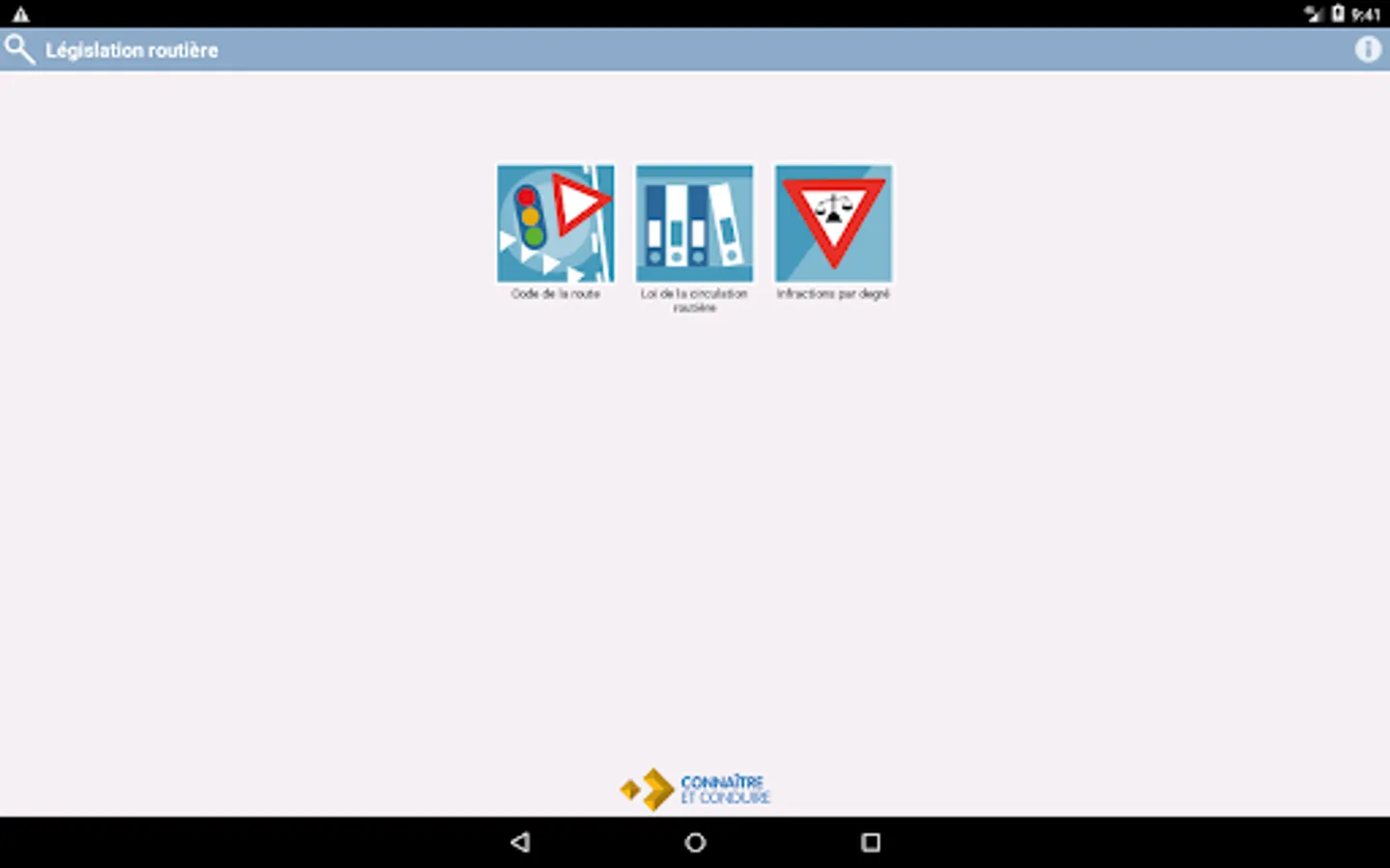 The application contains the complete and up-to-date legal texts of the Highway Code, the Road Traffic Law and Offenses by Degree. It does not contain an image and the articles are not commented on.