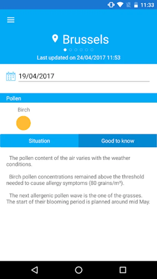 The network includes five stations spread over the country. They are located in Brussels, De Haan, Genk, Marche-en-Famenne and Tournai. The pollen concentrations are monitored from January to the end of September, whereas fungal spore concentrations are monitored until the end of November. The results shown on the application are updated daily for the Brussels station, and weekly for the other stations of the network.