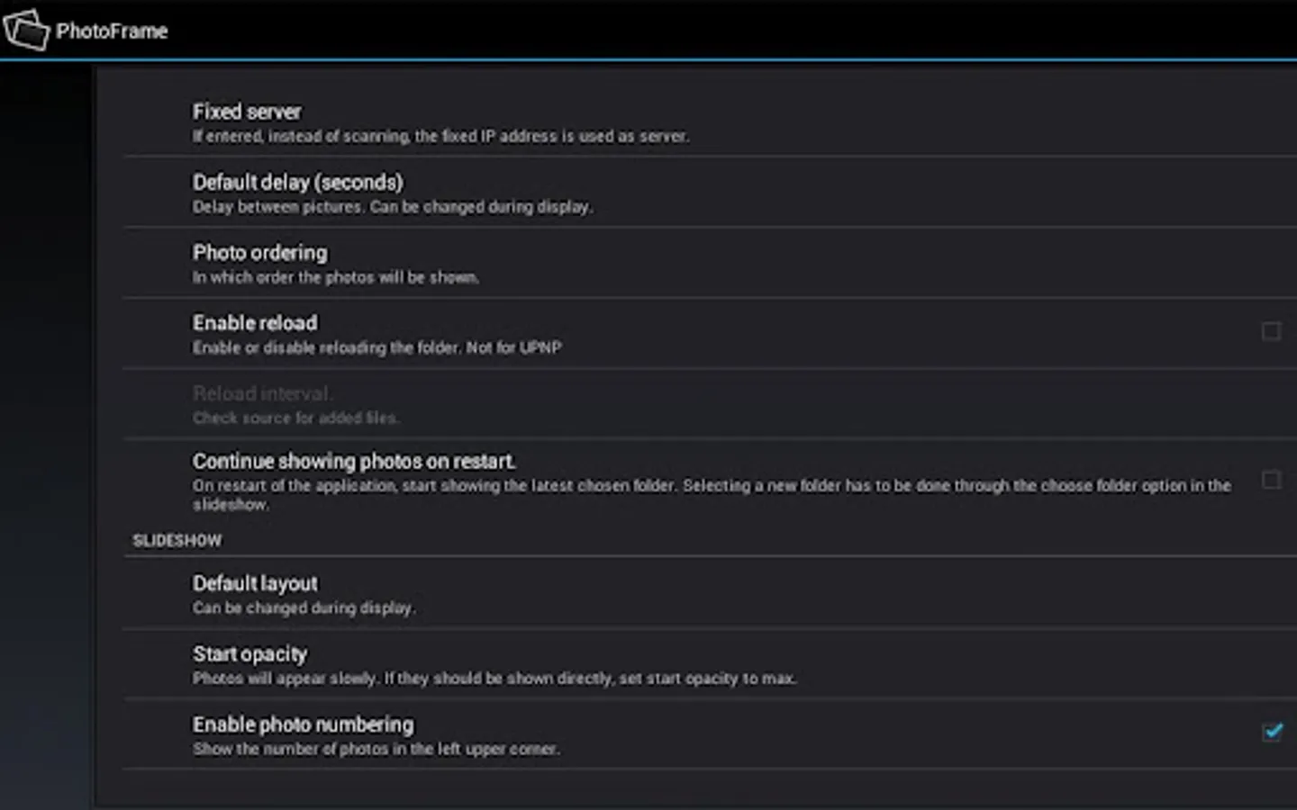 Turn your android device in a digital photo viewer showing a slideshow of local files, photos from network shares (samba/smb). The photos can also be selected from your Flickr, Google Photos or Dropbox account.