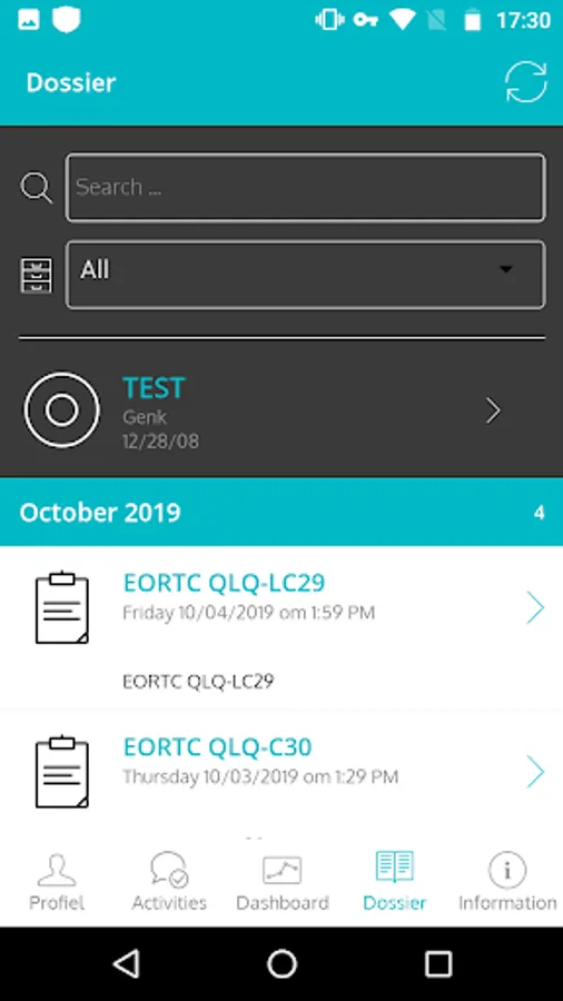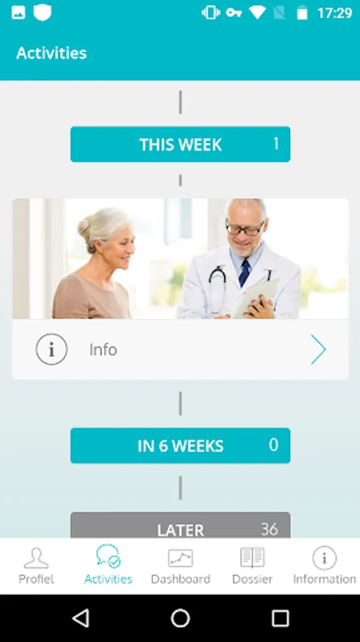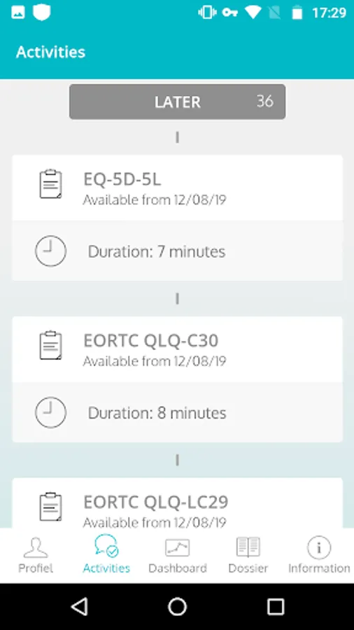 Under ACTIVITIES you will find questionnaires that fit in with your care path. If you have forgotten to fill in a questionnaire, you will receive a reminder here and you can see how long the questionnaire will remain available.