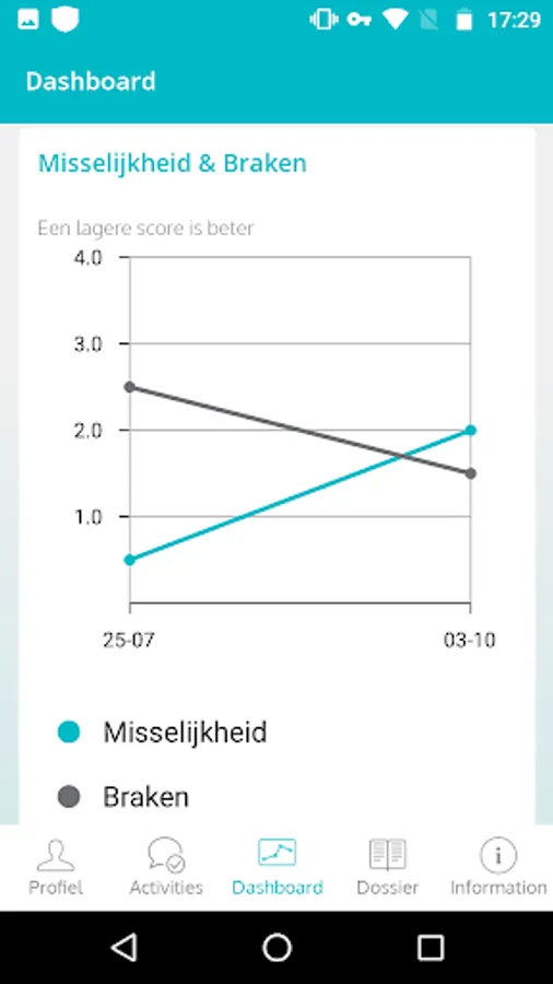 The DASHBOARD is a graphical representation of your answers to the questionnaires. In this way you can monitor whether your dizziness increases, decreases or remains stable week after week.