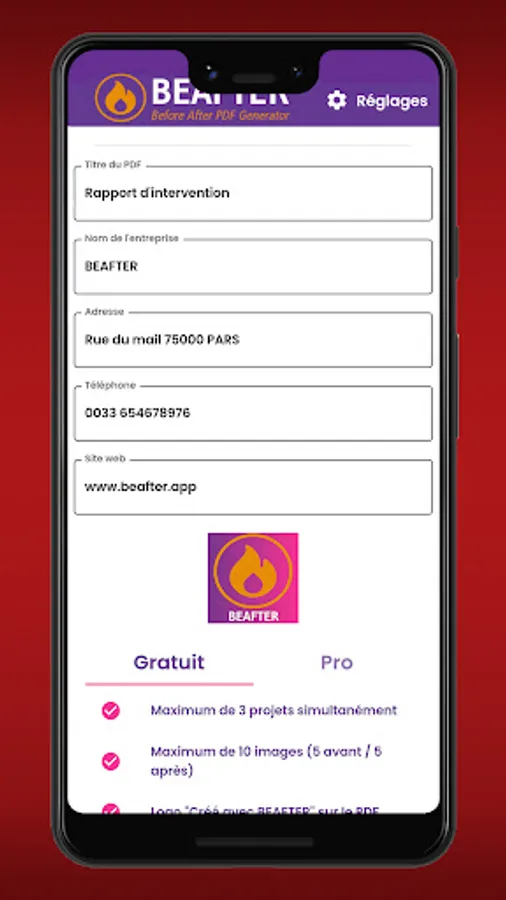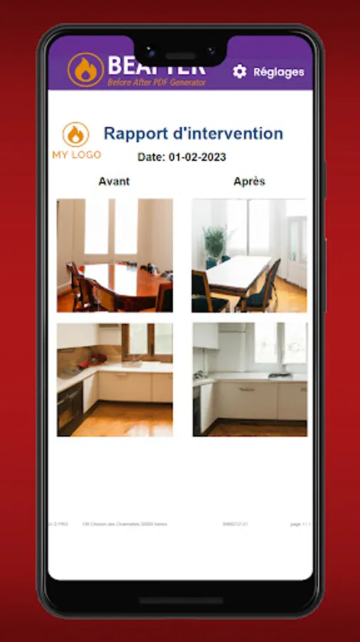 It is possible in the free version to customize the PDF report of before / after photos with your company logo, the title of your report, your company details, ...