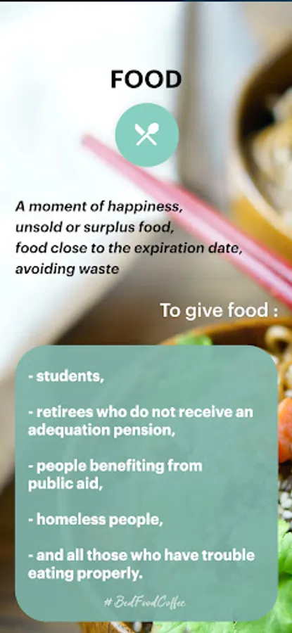 * You can search for or offer food (A moment of happiness, unsold or surplus food, food close to the expiration date) to help: