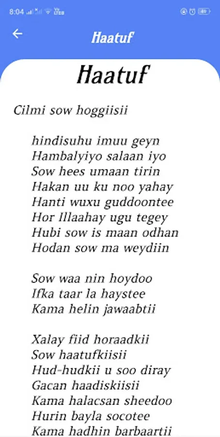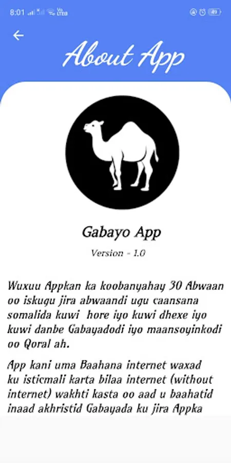 App kani uma Baahana internet waxad ku isticmali karta bilaa internet (without internet) wakhti kasta oo aad u baahatid inaad akhristid Gabayada ku jira Appka