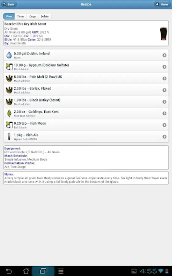 BeerSmith, the top selling home brewing software, comes to Android! BeerSmith Lite lets you search from thousands of beer recipes on our BeerSmithRecipes sharing site, and download and view them on your phone or tablet. The app is also tightly integrated with our desktop software and cloud recipe service, making it a snap to view your recipes on the go. An integrated brew day timer with notifications shows you step by step instructions for your recipes and plays an alarm as each completes. A beer style guide, ingredient reference, set of 7 brewing calculators and unit converters rounds out this great app!
