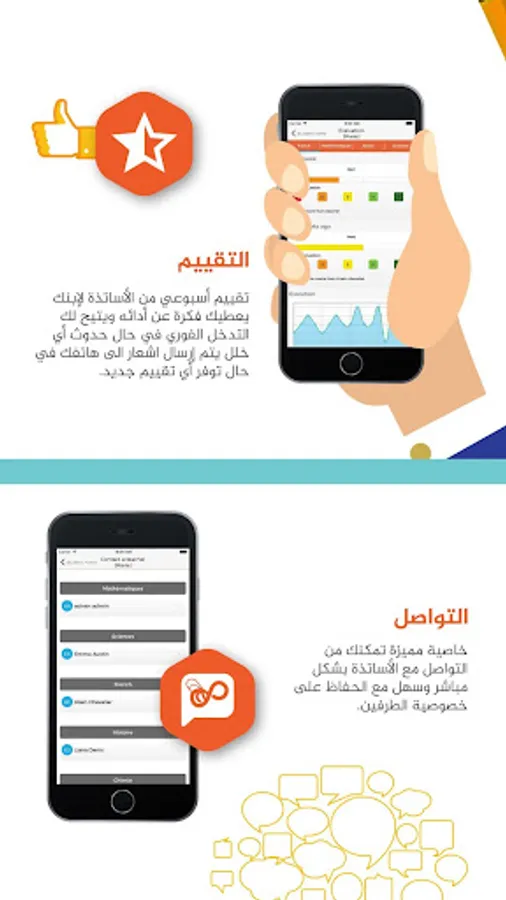 This application will allow people to access directly through their phone on: the daily program of their son, school diary, appointments and decisions of the exams, grades, evaluate the performance of teachers to all this through notices to keep them permanently informed and enable them to intervene in a timely fashion always. It is also possible to communicate with the educational and administrative apparatus through the application quickly and directly without breaking into the privacy of any of the parties. On the other hand, this will help the administrative system application to keep teachers and parents aware of all news, decisions and updates as they are released, and also will help to encourage them to participate in these decisions by answering the polls directly through their
