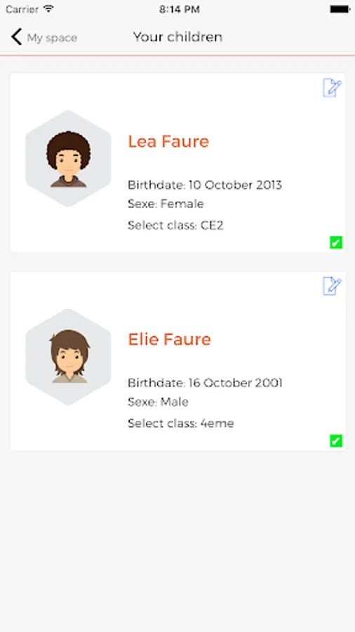 The teacher interface of the mobile application allows teachers to add daily diary, exam and weeks evaluation of their students. They can also discuss with students parents in a secure way. Additionally, teachers can send and receives messages from the school direction. They can also participates to surveys organized by the school.