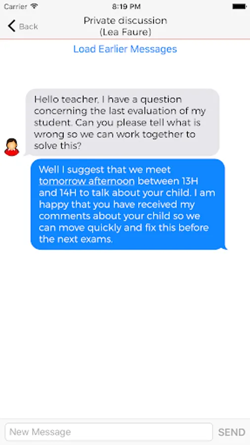 The teacher interface of the mobile application allows teachers to add daily diary, exam and weeks evaluation of their students. They can also discuss with students parents in a secure way. Additionally, teachers can send and receives messages from the school direction. They can also participates to surveys organized by the school.