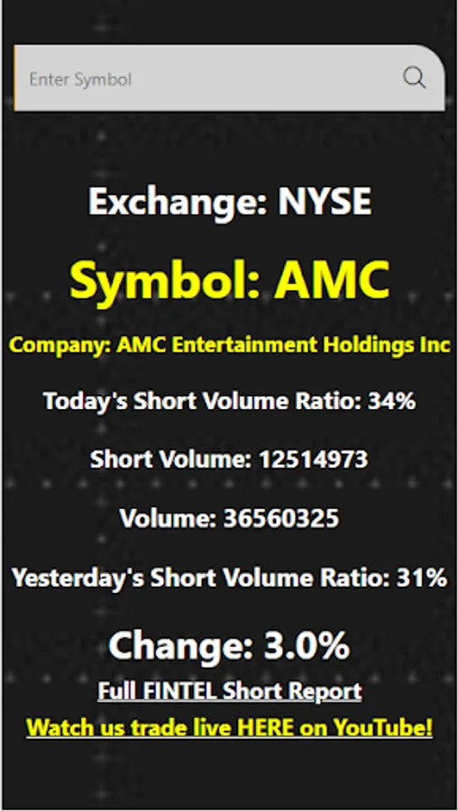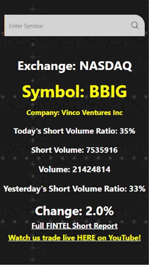 Details short data for any major listed symbol on the Nasdaq, NYSE, & more. You are able to get short volume statistics, short float information, plus company info for free.