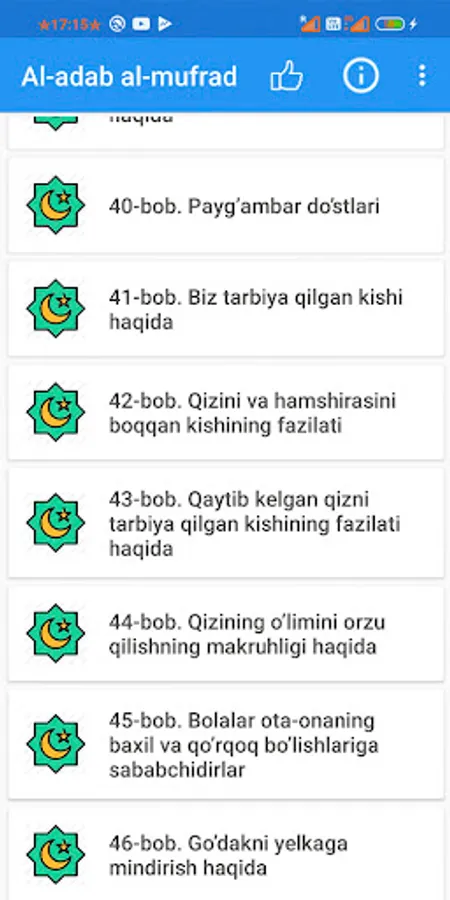 Kitobda Muhammad paygʻambarning odob-axloqi toʻgʻrisida hadislar bor. Asardan umumiy 1322 hadis joy olgan.