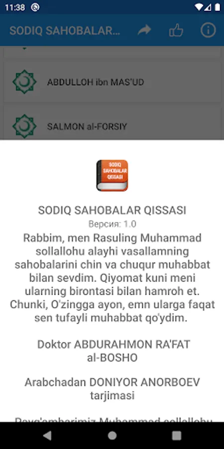 Payg'ambarimiz Muhammad sollallohu alayhi vasallamning iltifotlariga sazovor bo'lgan sodiq sahobalarning hayot va faoliyatlari, ularning islomni yoyishdagi barakali sa'y harakatlari, fidoiyloiklari dun musululu muslim Ular haqidagi rivoyatlarni o'qish bizga ham nasib etgani uchun Alloh taologa beadad shukrlar bo'lsin.