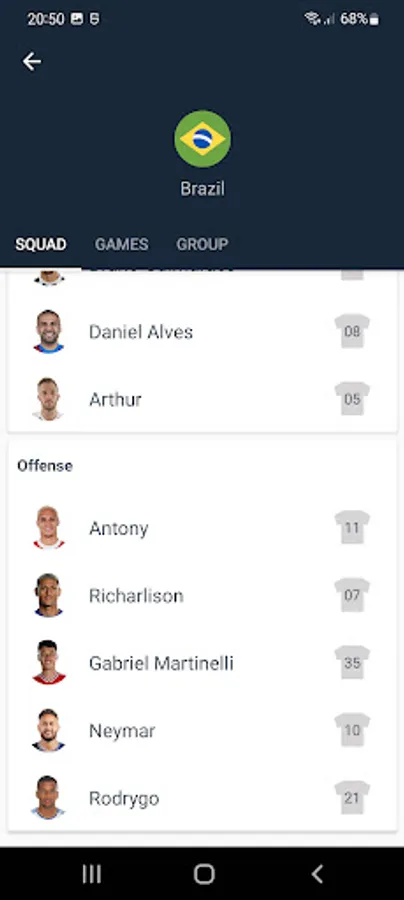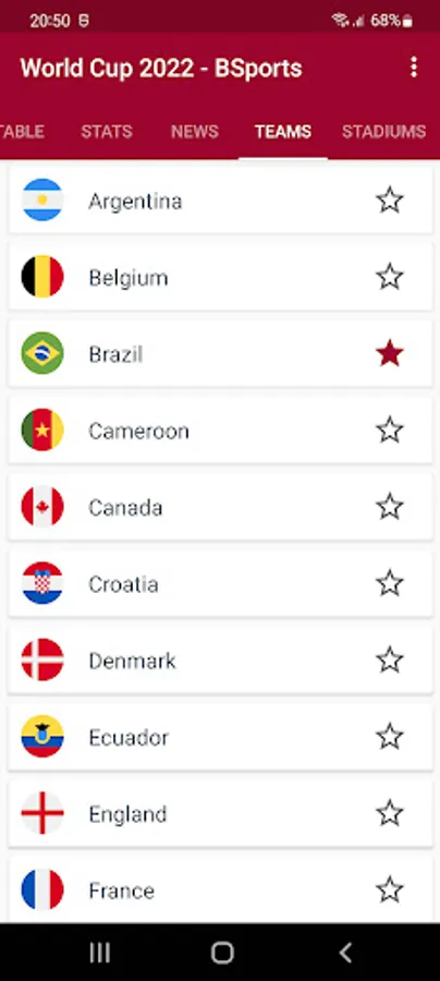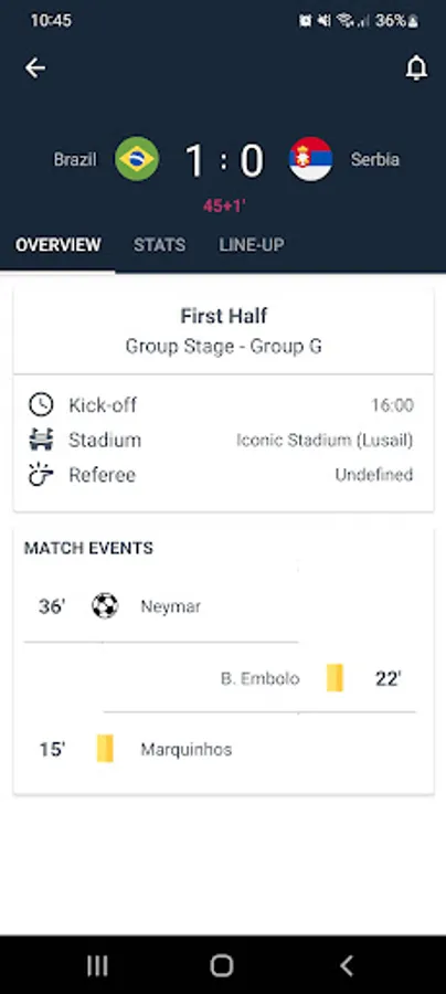 The teams have detailed information about their squad, games and performance in the group and knockout stages. Choose your favorite teams and get notifications for lineups, match start, goals and more.