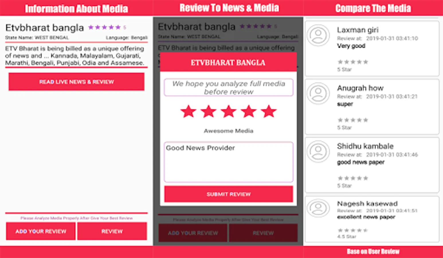App Is providing the user review audit and rating system, User Can Upload the media and News and others will provide his opinion and rating on News and media with the rating.