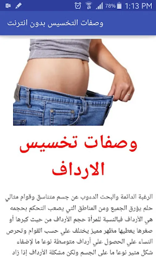 اليكم احدث وصفات تنحيف البطن و الخصر وشد الجسم وهذا تطبيق يحتوي على وصفات للتخسيس و نقصان الوزن وطرق التخلص من الكرش (بدون نت) وصفات التخسيس بدون انترنت تخسيس الجسم في أسبوع بدون نت