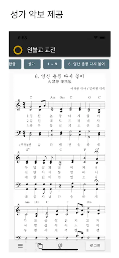 In particular, since the hymn contains sheet music, even those who do not know the song can watch Won Buddhism Encounter for iPhone and sing along with it.