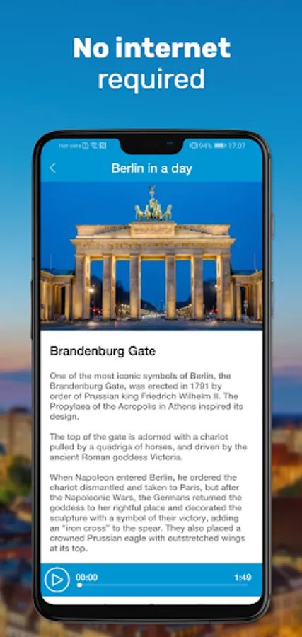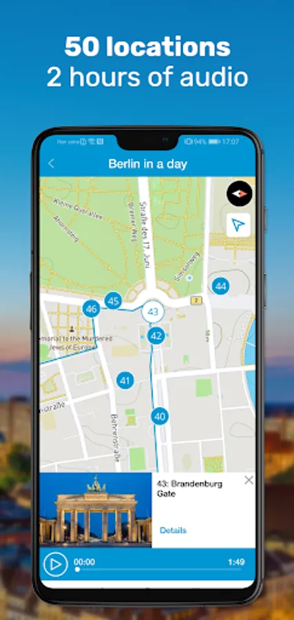 Due to the in-built Berlin offline map and pre-planned route, you will easily explore the city, even if it’s your first visit to Germany. Just follow the line on the application’s map, and discover step-by-step the rich history of Berlin from its very first days till the modern time.
