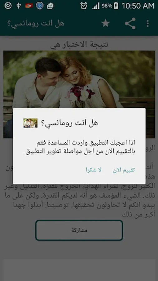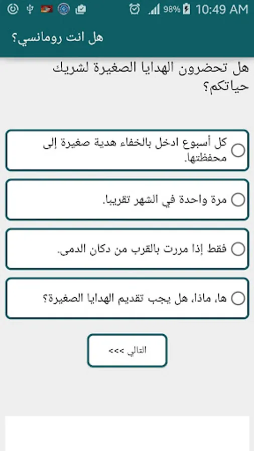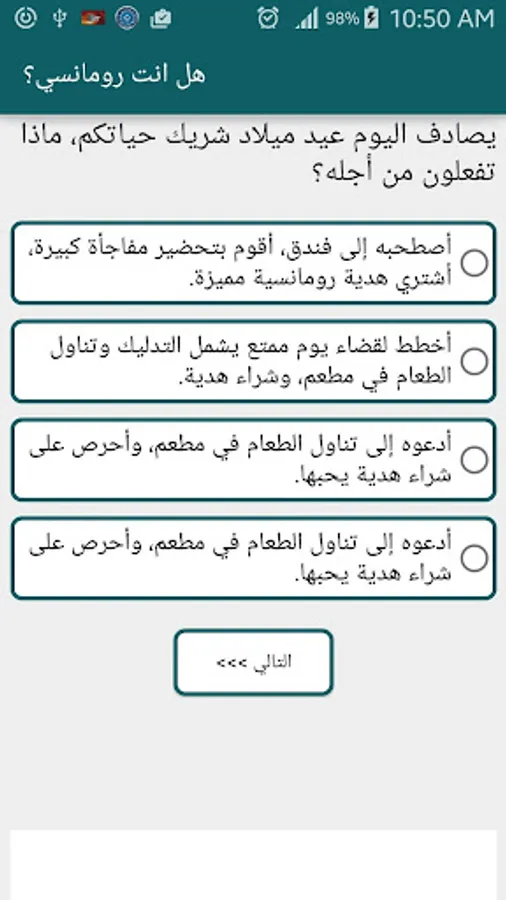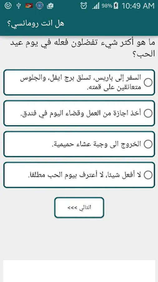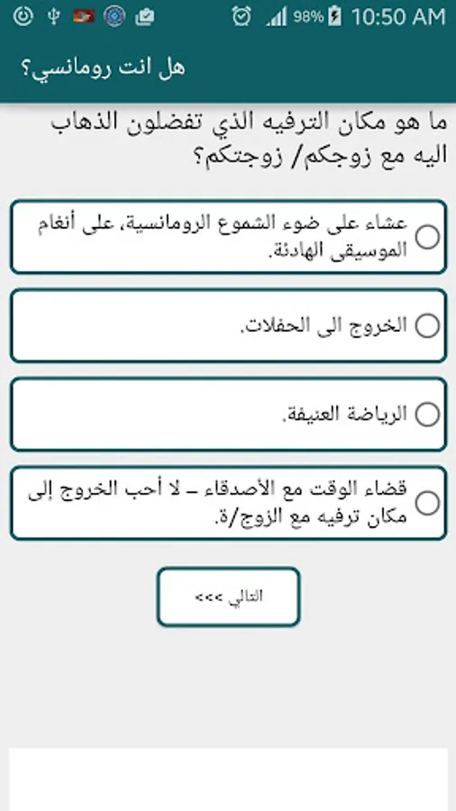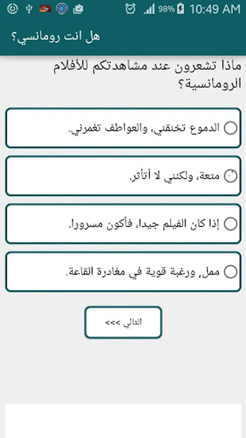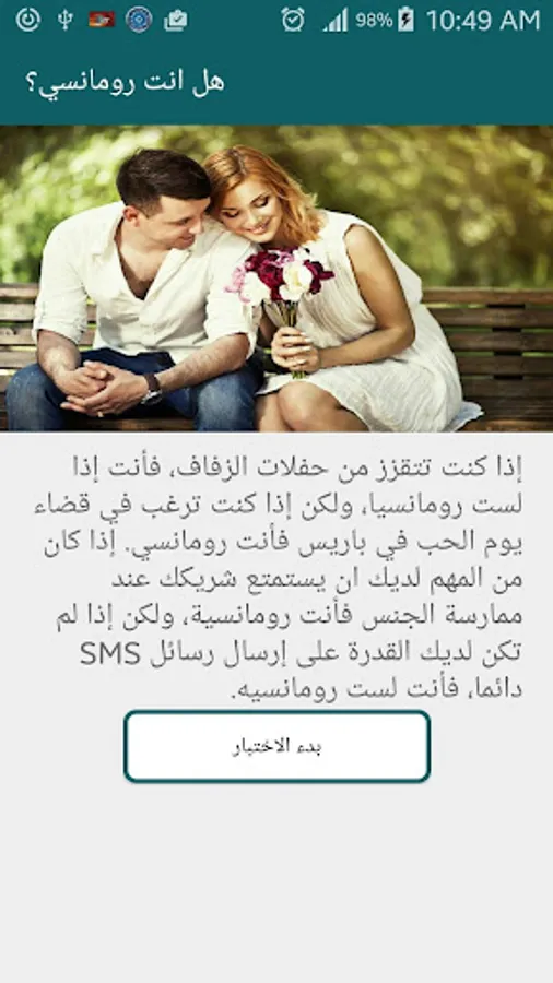 اكشف نفسك .......هل انت رومنسي ؟ في أيامنا هذه ، حيث تربعت الماديات على عرش حياتنا ، و أصبحت القسوة و الجفاف في التعامل هو النمط السائد ، حتى أصبحت الرومانسية لا توجد إلا في الروايات و القصص و بعض المسلسلات و الأفلام التلفزيونية ، و عند قلة قليلة من البشر !!! لكن مع ذلك ، أصبحنا نحنّ و نشتاق لجلسة هادئة صافية " حتى لو مع أنفسنا " ، علنا نشعر براحة ، و أصبحنا لا ندرك مدى عظمة الكون من حولنا ، و جمال الاشياء الا عندما نفقدها ! ف شو رأيكم نعمل هالاختبار البسيط لحتى نقيس درجة و مقياس الرومانسية عندنا؟ المقياس