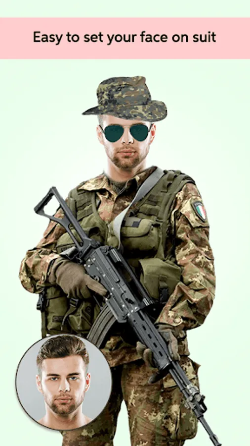 Set your face in single touch as per your need, you can change your look with using different Military Man Suits. Military Man Photo Editor App designed in such a way that all suits fit to all kind of person face. Just a single click and you can try wide variety of suits on you.