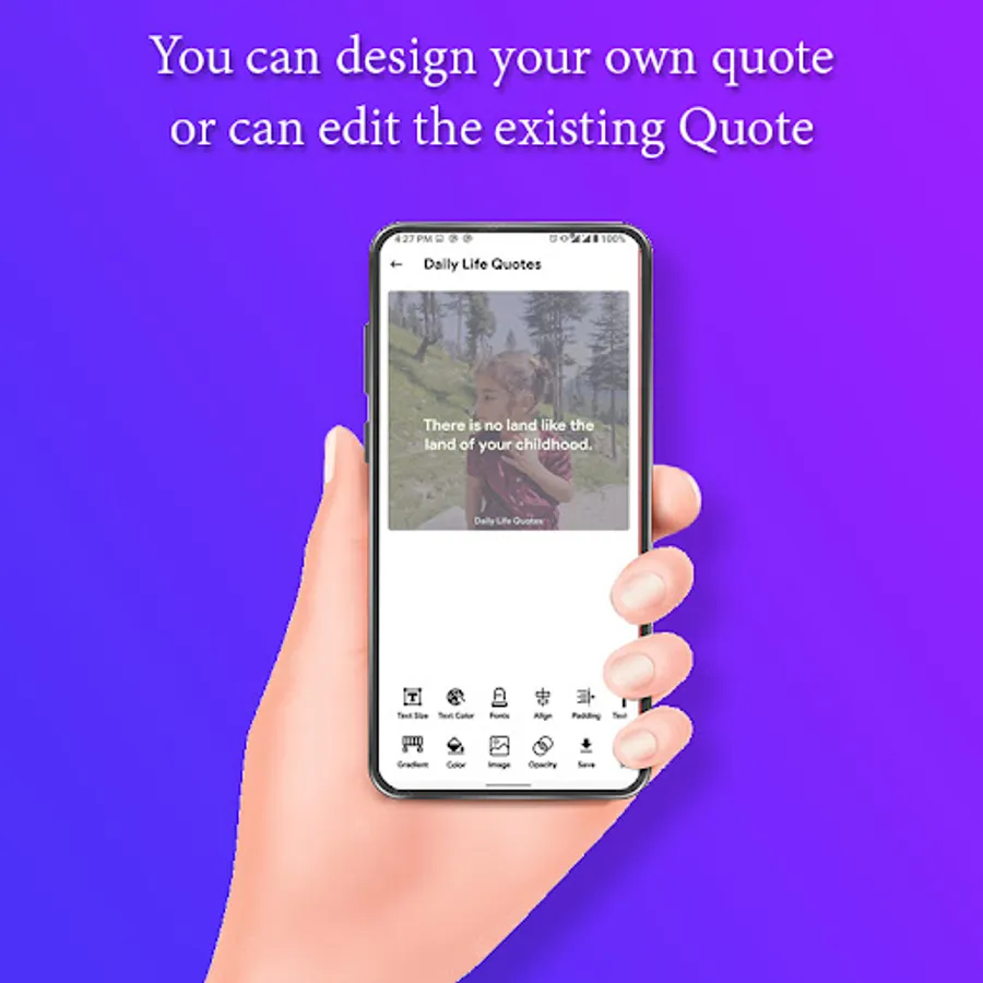 and can put their own background image and can also set the propetries to text for example text size, text color and fonts etc. User can make its own type of quotes like Inspirational Quotes,