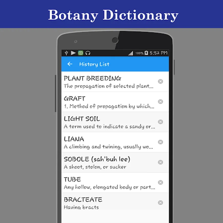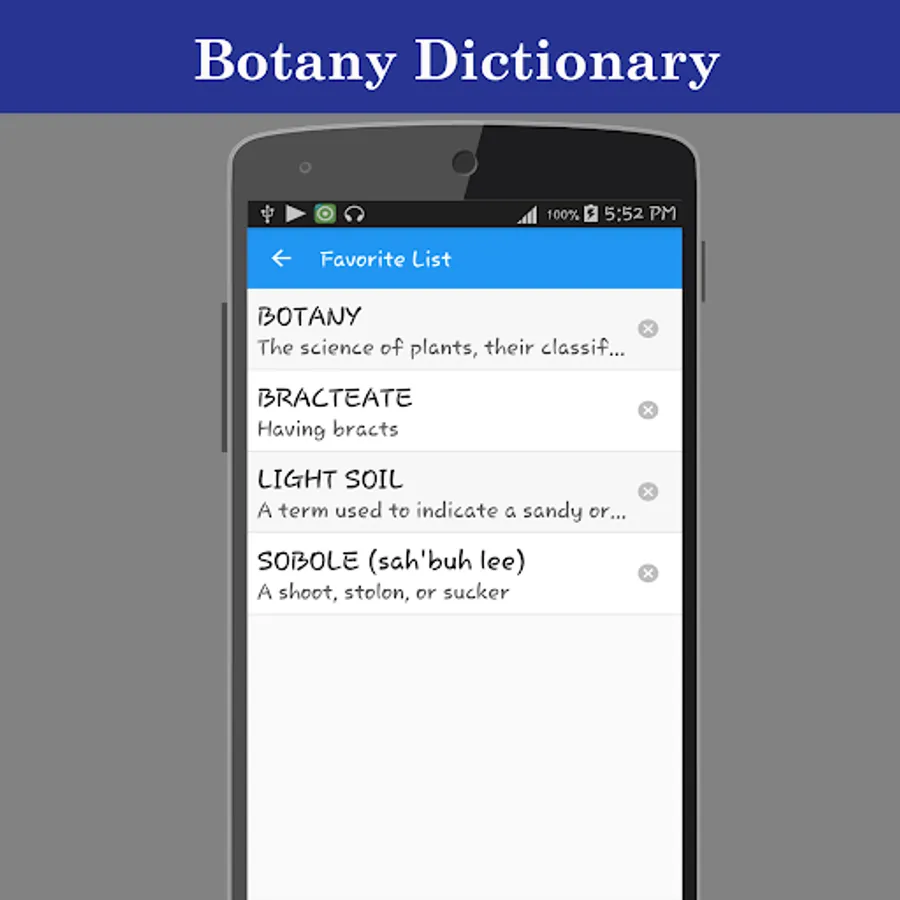 Download the largest Botany dictionary with over lakhs of Botany words. Meaning of words are provided with definition, synonyms and antonyms. Meanings are provided with usage and example sentences to understand proper translation. One can listen pronunciation of Botany words to read and speak words properly.