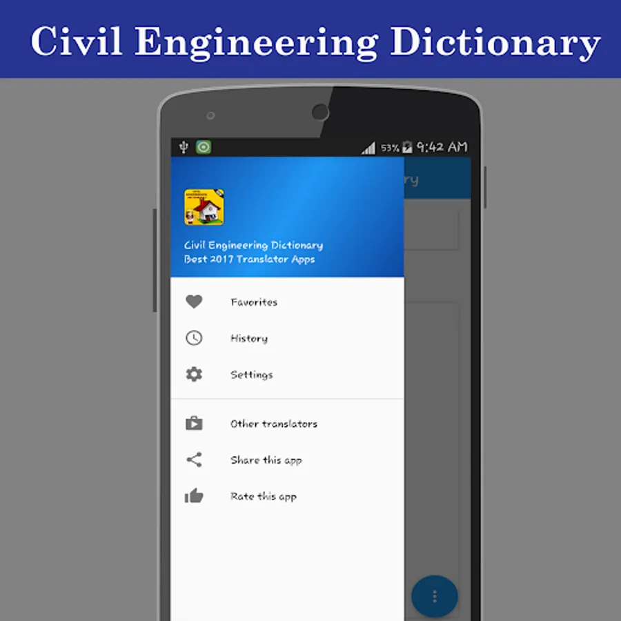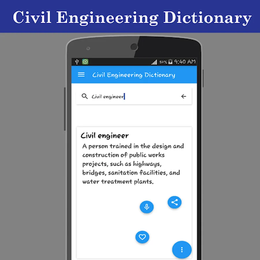 Download the largest Civil Engineering dictionary with over lakhs of Civil Engineering words. Meaning of words are provided with definition, synonyms and antonyms. Meanings are provided with usage and example sentences to understand proper translation. One can listen pronunciation of Civil Engineering words to read and speak words properly.