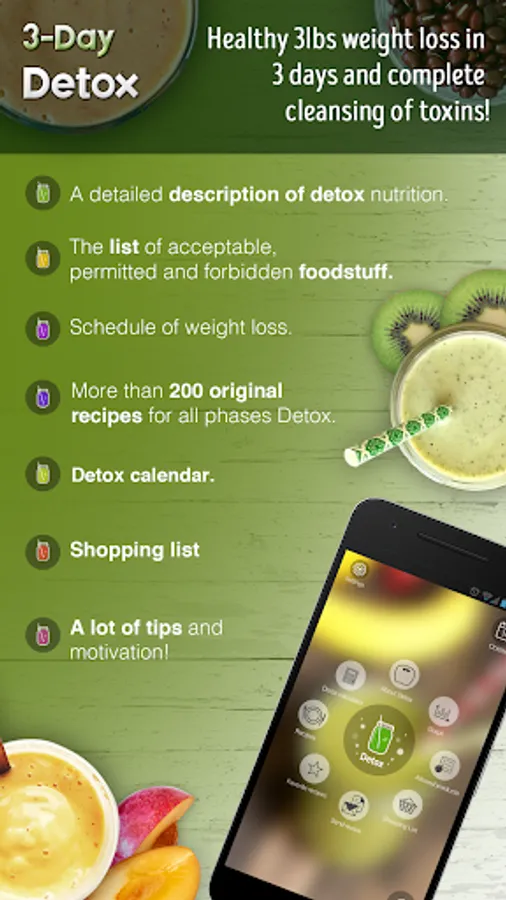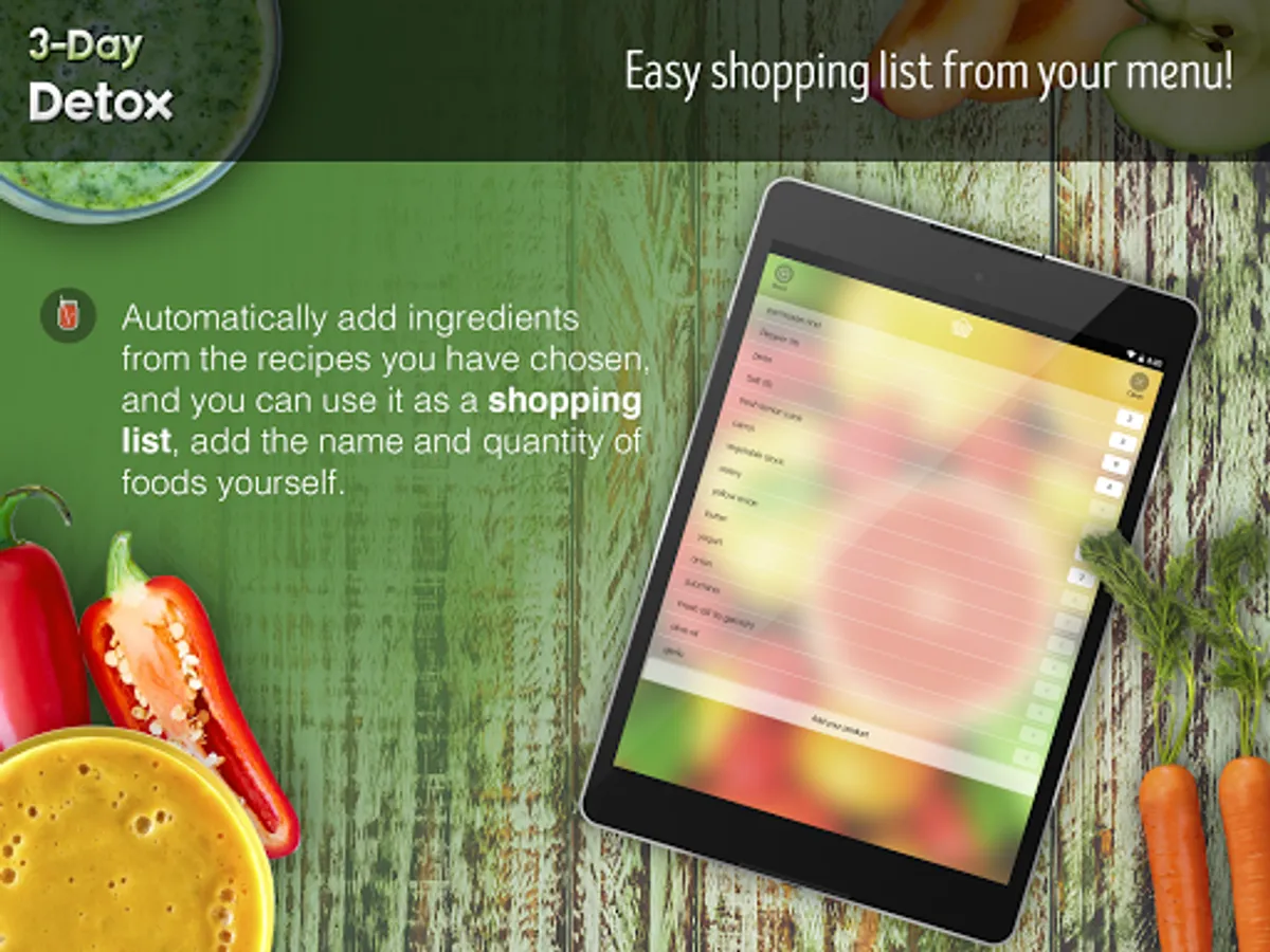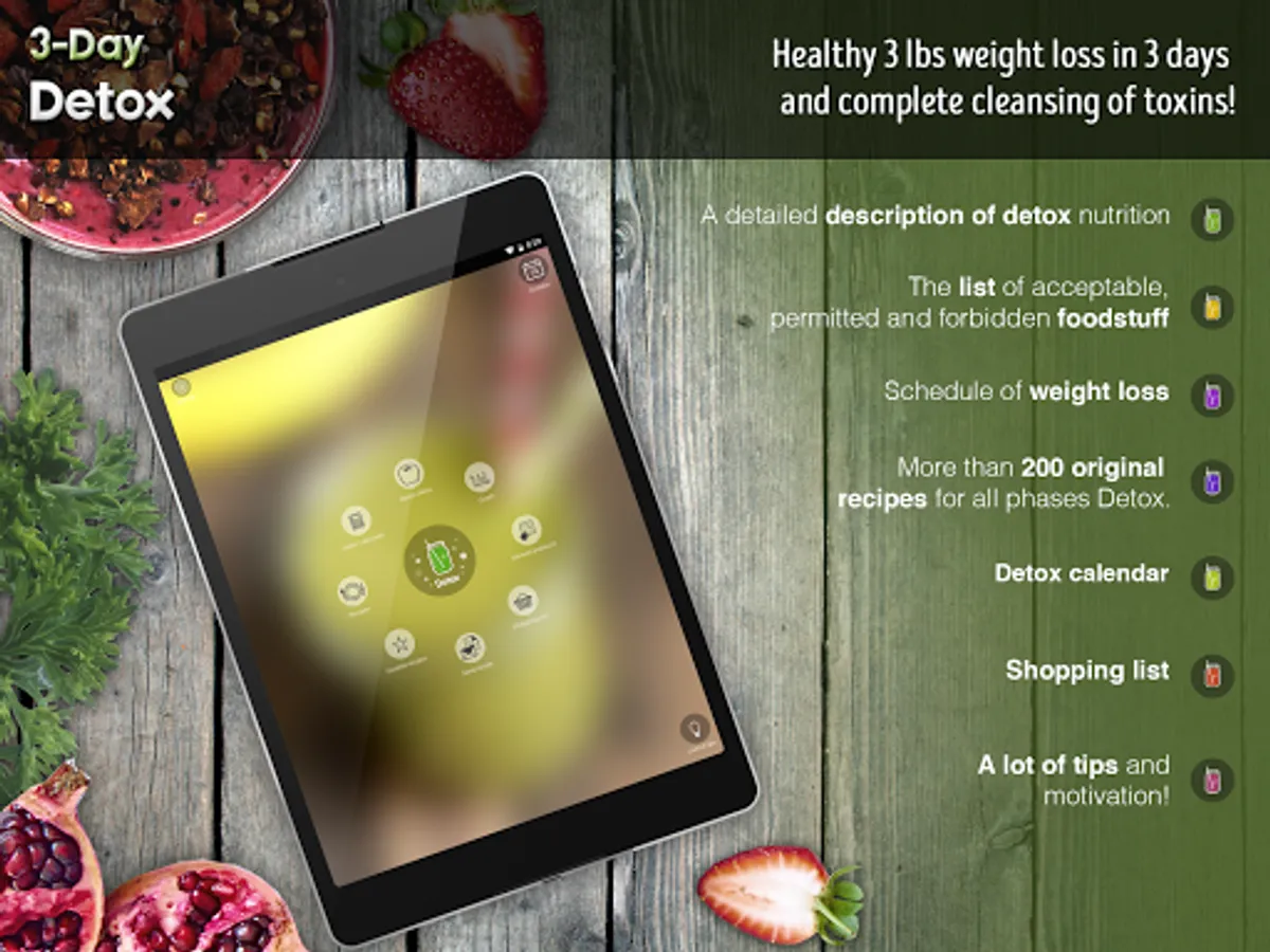 Our app 3-Day Detox will be indispensable assistant and will motivate you to not only get in shape and achieve a state of purity, a little-known today. There you will find everything you need for an easy and pleasant detox of the body.