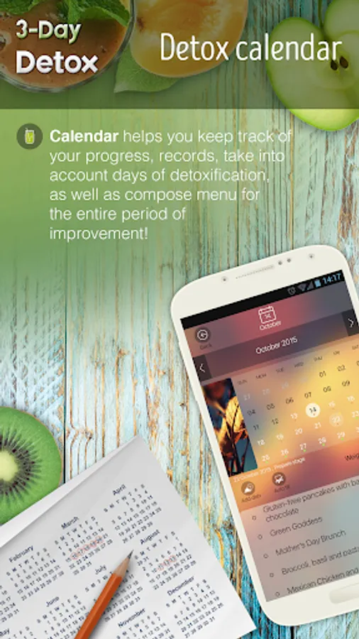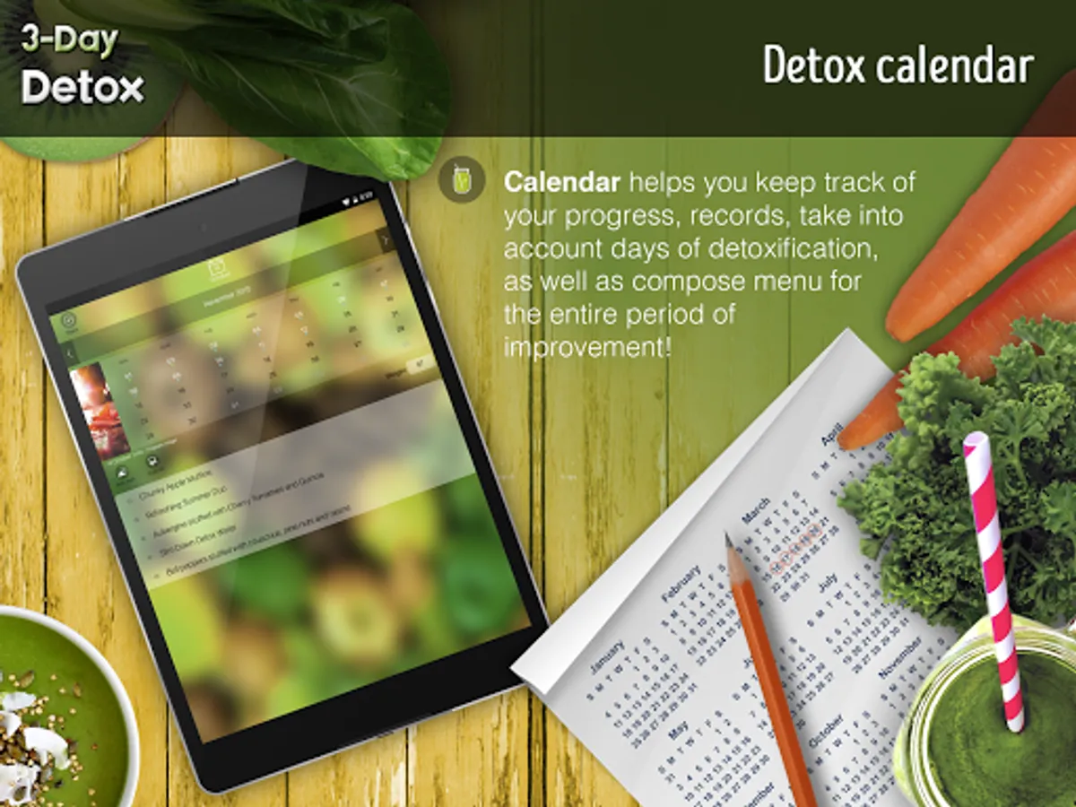 * Detox calendar. Calendar helps you keep track of your progress, records, take into account days of detoxification, as well as compose menu for the entire period of improvement!