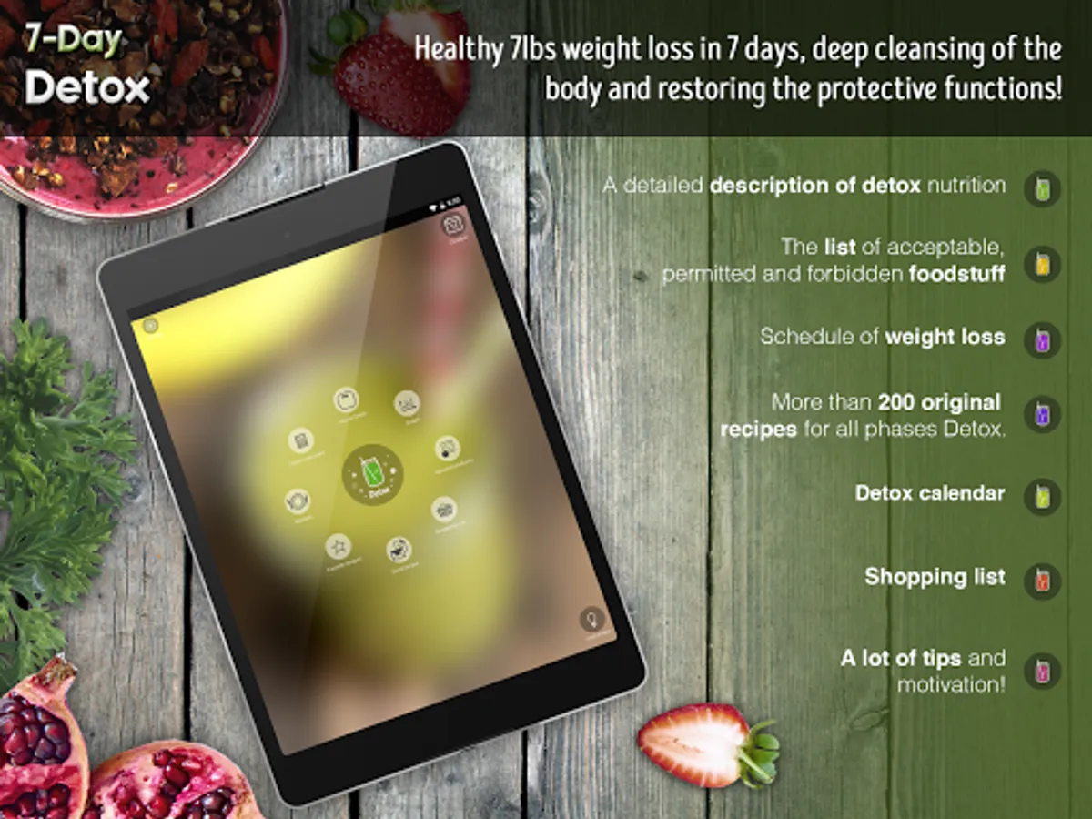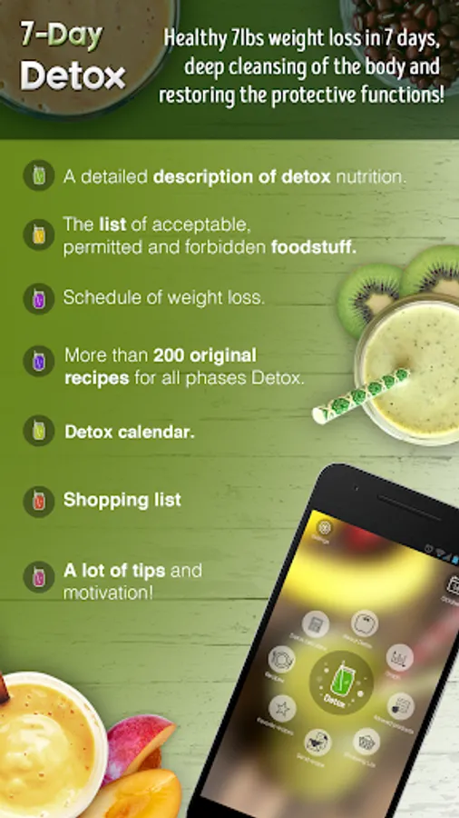 Our app 7-Day Detox will be indispensable assistant and will motivate you to not only get in shape and achieve a state of purity, a little-known today. There you will find everything you need for an easy and pleasant detox of the body.